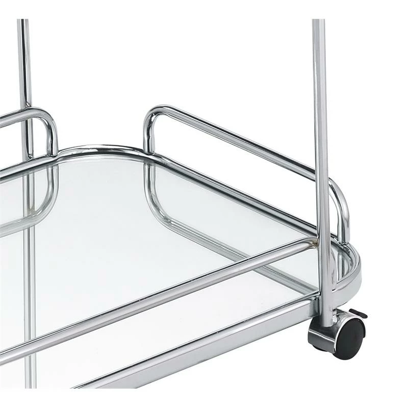 Grab the attention of your guests with a movable feast. This serving cart features two tier shelf that allow you to set drinks and snacks on top. It is founded atop a clean-lined metal frame, with clear glass and chrome finish that showcase a streamlined, modern aesthetic. There are also side rails and wheel stop included for safe and secure storage for your fragile glassware and wine collection.