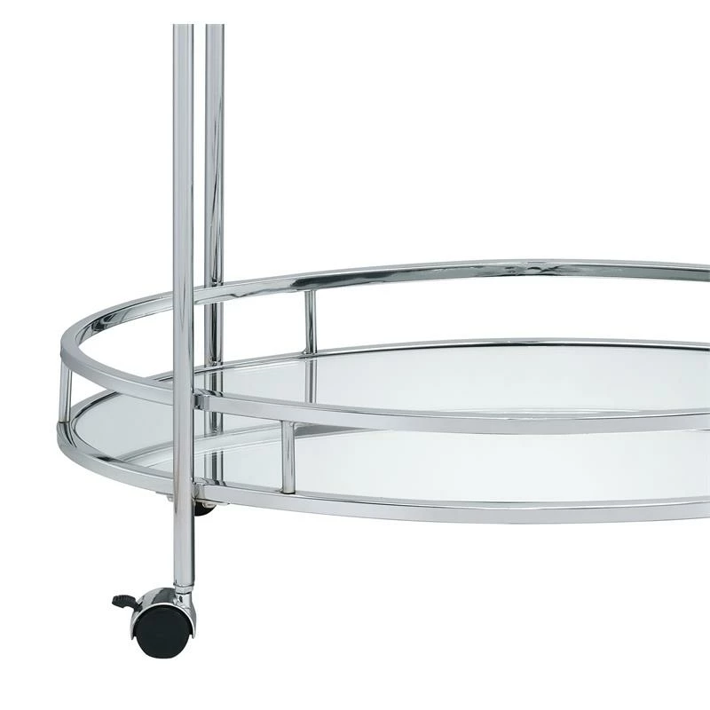 Instantly transform an ordinary room in to a minibar with this brilliant accessory. Two clear glass shelf allow you to display delicious drinks and delicate glassware. Supporting metal frame features a simplistic silhouette with chrome finish giving a modern touch. Two handle design and wheel stop make it easy to move around and place it where needed.