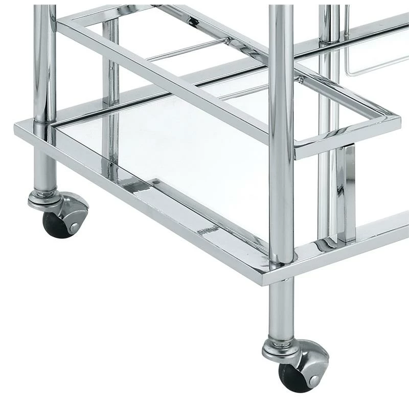 Showcase your cherish collection with this serving cart that exudes an air of modern sophistication. The serving cart features a clean-lined metal framework, with a lustrous chrome finish brimming with modern shine. Clear glass top and shelves complement your glassware perfectly. It offers three-tier shelf with side rails to keep all of your storage secure when moving. What ‘more, cart handle and wheel stop added to it’s sturdy metal frame prevent it from being liable to overturn.