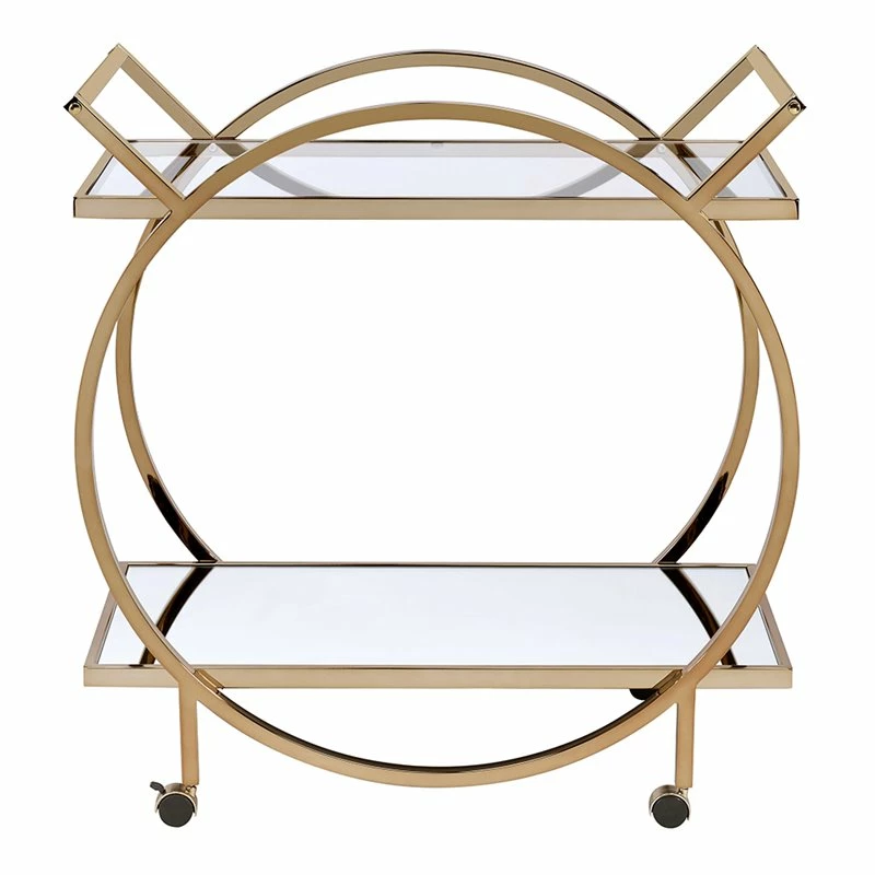 Roll out an artful decor anywhere in your home with this Traverse serving cart. Crafted with quality metal tube, the beautiful frame is finished in elegant champagne. With the glass top shelf and mirrored bottom shelf, its timeless design will conjure up the entire atmosphere. Top it off with trays of delicious pastries and a pitcher of fruity sangria for a tasty treat at your next festive get-together or simply display few glittering jewelry trees to complement your master suite vanity; it is destined to be your favorite piece.