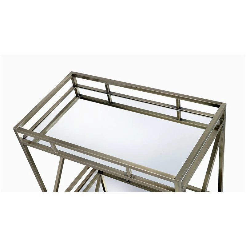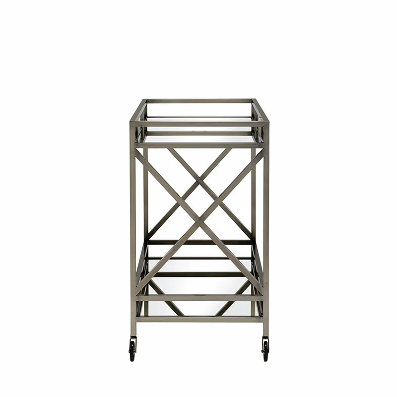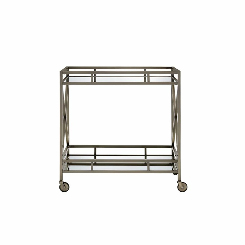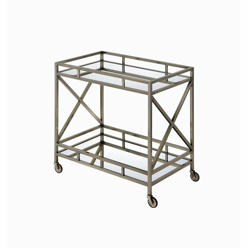 Serving up a chic flair for any space in your home, this Kristensen serving cart offers both functionality and superiority. Openwork frame is crafted of metal and finished in antique brass while the 2 tiers feature a mirrored design. With 4-wheel caster base, you can effortlessly roll it around. Simply stack up glossy art books and metallic vases on this stunning piece, and it will bring a distinctive foyer accent to your space.