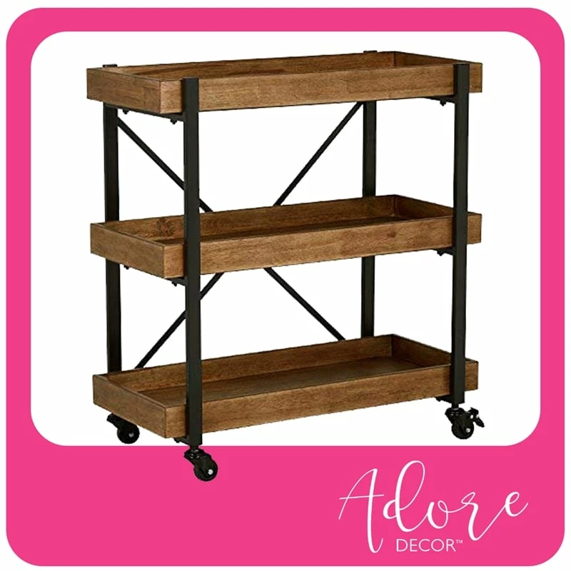 Decidedly modern, this rolling bar cart enhances the unique personality of your home. The frame is finished in matte black and the medium brown wood finish brings out the natural grains and coordinates beautifully with the surrounding industrial accents. The versatility of this cart goes beyond double duty: consider it a possible side table, nestled beside a contemporary couch or chair; styled with your ceramic bookends for a striking bookcase; in your home office to showcase framed photos above and reference materials below. Of course, this bar cart instantly upgrades the feeling of any party when you display your favorite drinks and glassware on it. Just unlock the wheels to move it from your dining room and into your gathering space, and lock them when you’re ready to serve.