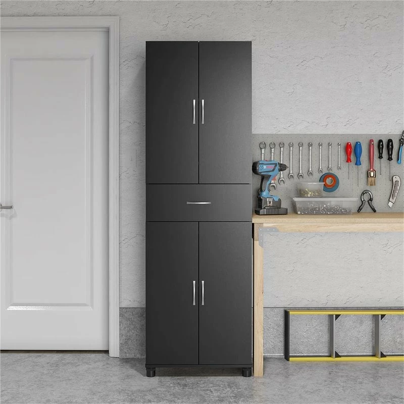Get extra storage where you need it most with the SystemBuild Lonn Storage Cabinet with Drawer. The black finish on the laminated particleboard gives the Cabinet a modern look at an affordable price. The Cabinet features 2 upper and lower doors and a drawer for concealed storage wherever you need. Behind each of the doors are 1 adjustable and 1 fixed shelf for plenty of space to store both large and small items. Store away and organize everything from kitchen pantry items, cleaning supplies, office supplies, and board games. The drawer is a perfect spot to store away smaller items like batteries, writing utensils, or stationary and features metal slides for years of use. The adjustable feet make keeping your Cabinet level on uneven floors simple. A wall anchor kit is included to prevent tipping injuries and keep your family safe. Use this piece as a stand-alone item, or combine it with additional SystemBuild Lonn storage items to create the perfect storage solution for your home. The Storage Cabinet ships flat to your door and requires assembly upon opening. Two adults are recommended to assemble. Once assembled, the Storage Cabinet measures to be 75.25”H x 23.46”W x 15.4”D.