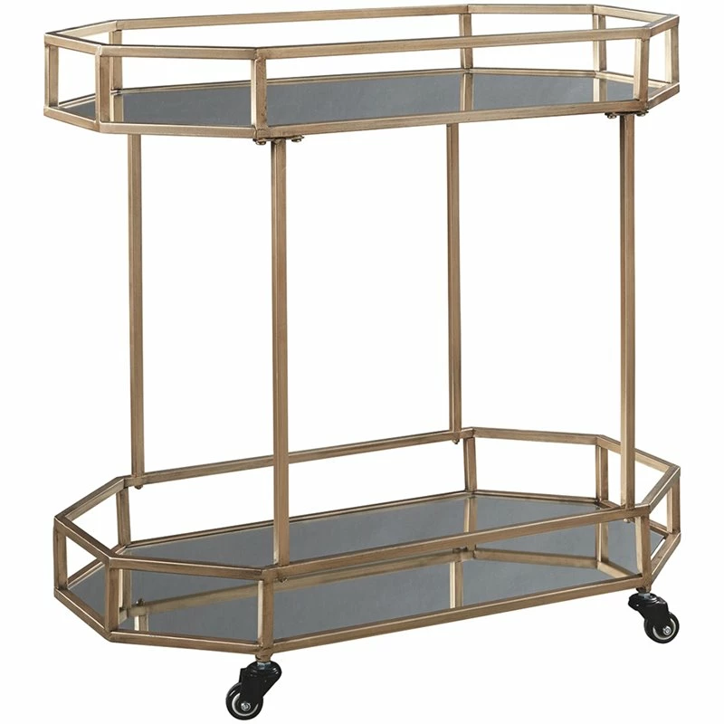 The Daymont bar cart entices with a high glam appeal that knows how to strike a stylish pose. Mirrored shelves are a trendy complement to the gold-tone finished metal. Its open-concept frame has plenty of chic panache to accompany drinks and glassware. Convenient caster wheels make transport a breeze.