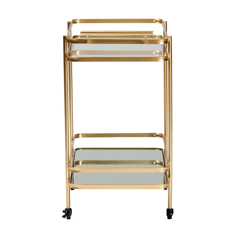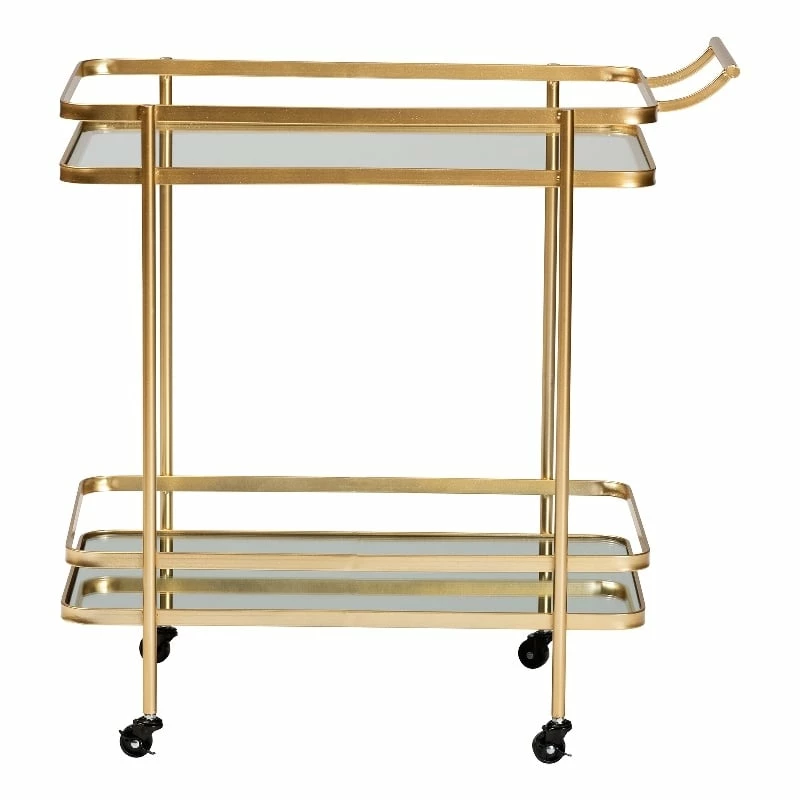 An exquisite design makes the Destin wine cart a perfect attendant to serve or display your wine collection. Made in China, the Destin is comprised of a stunning brushed gold finished metal frame fitted with two tiers of clear glass and mirrored glass shelves. The borders of each shelf are protected with guard rails to secure items. Fully assembled, the Destin rests on four caster wheels for versatile movement. A handy and visually striking serving station, the Destin wine cart is an excellent accessory for any enthusiast.