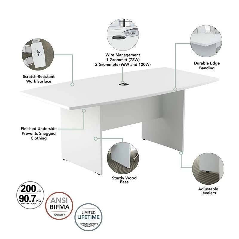 Bring your team together in a private or open plan office with the Bush Business Furniture 72W x 36D Boat Shaped Conference Table. Perfect for small to medium-sized groups, this meeting table provides ample room for 4-6 users to collaborate with laptops, paperwork and other materials. A durable thermally fused laminate surface with continuous edge banding protects against everyday damage while a finished underside prevents snagged clothing. The tabletop also includes a wire management grommet to accommodate a projector or speaker phone. The conference room table is supported by a sturdy wooden base for a weight capacity of 200 pounds, making it great for use in a variety of professional and educational settings. This long office table is tested to meet ANSI/BIFMA standards for safety and performance and is backed by a Limited Lifetime Warranty. American made with U.S. and imported parts.