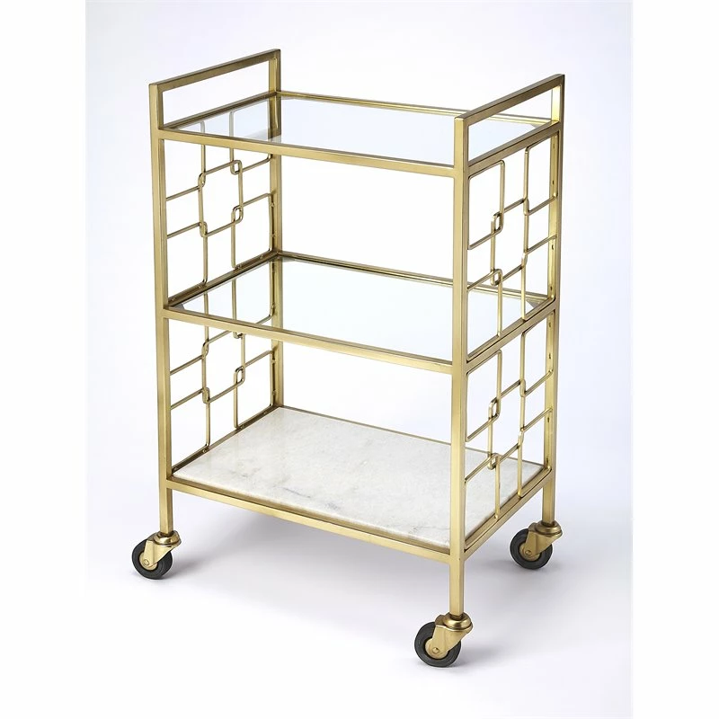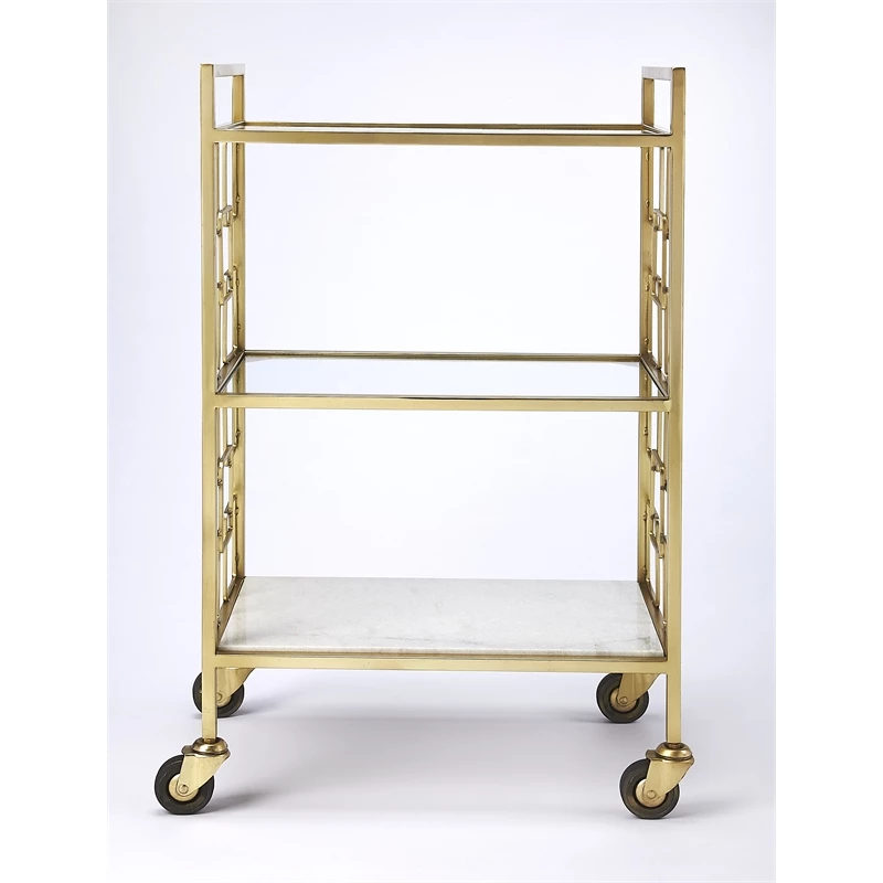 This entertaining bar cart is a beautiful, modern design boasting an elegant gold finish. It makes it easy to serve your guests in style! This cart features glass on the top and middle shelves while a gleaming white stone bottom shelf offers a great solid look. The caster wheels make it easy to transport and entertain your guests. This is a great addition to you home as a cart or as an accent table area; it is a true look of elegance.