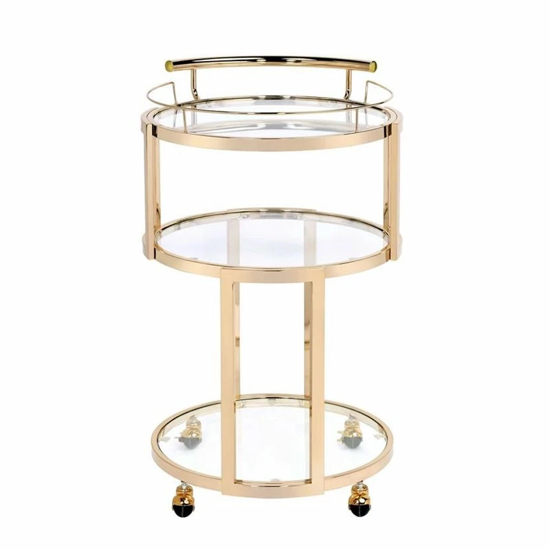 Serve your guests in a classy and stylish manner with the inclusion of this sturdy metal constructed serving cart featuring contemporary style. Showcasing 3 tier design, it has round glass shelves to keep your while bottles and other belongings. Casters are provided for easy mobility.