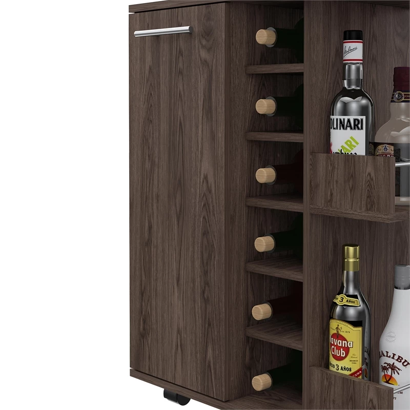 The Bowery Hill Bar Cart brings mobility and functionality together. The smooth open top counter is perfect for placing cocktails during a function or showcasing decor any other day of the week. Six cubbies vertically line the middle of the unit while a large two-tiered shelf cabinet space on the left provides the perfect storage option for all your bottled needs. Two large side shelves for displaying your finest spirits complete this modern stylish piece. Made of particle board in Weathered oak in Cognac Finish.