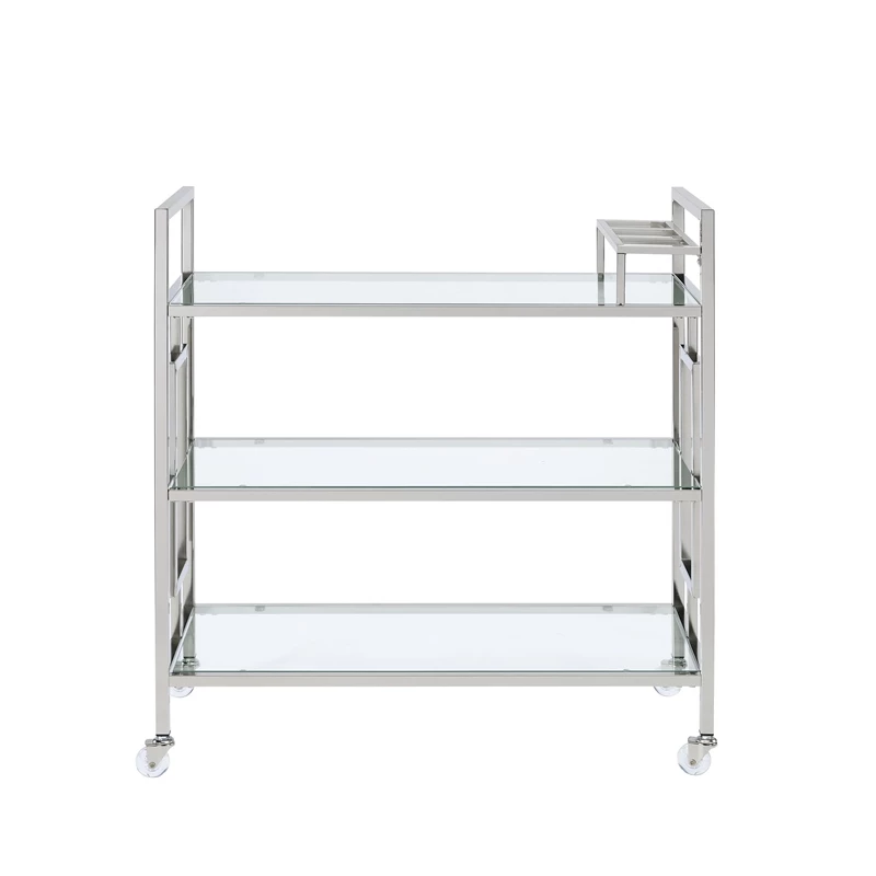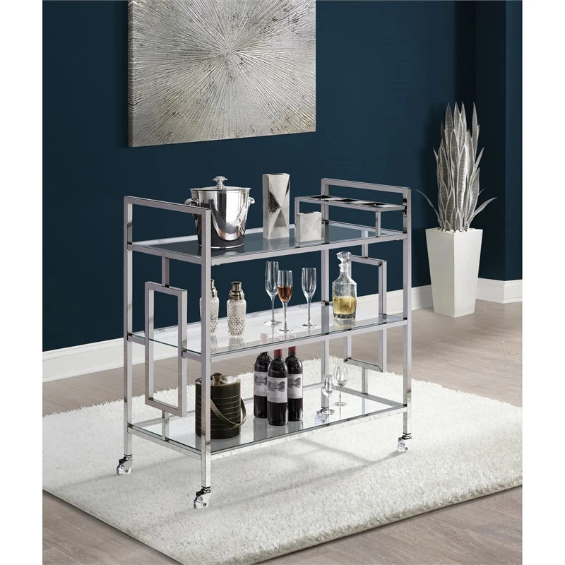 The Bowery Hill Serving Bar Cart is modern glam at its best! This rectangular glass bar cart will give your living room or dining room the extra pizzazz it needs. This cart features three clear tempered glass shelves for your serving pleasure. If you want to impress your guests, you can travel with this cart from room to room serving beverages as this cart comes with casters. The sides of the cart display an intricate chrome design adding extra flair to this already stylish piece. Adding this piece to your home will instantly add style and glam, a look you’ll never get tired of.