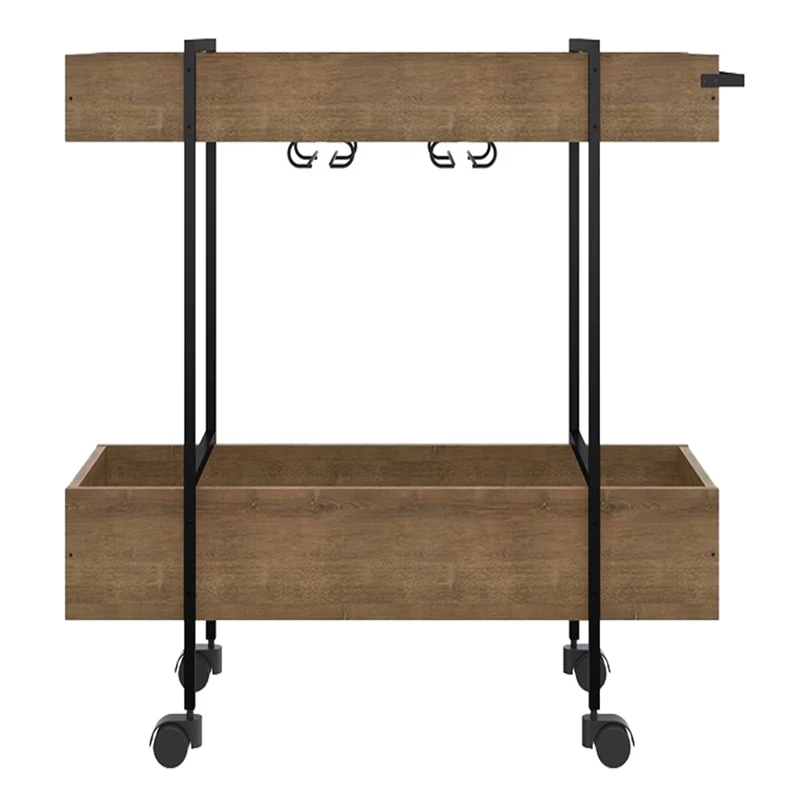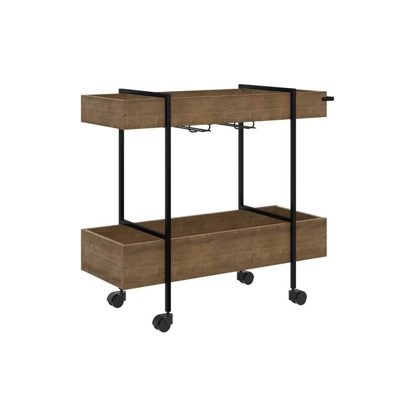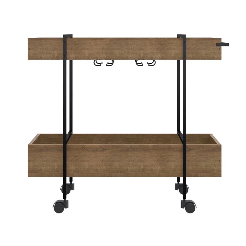 The Peak bar cart part of our KD collection in walnut melamine with black painted metal frame features clean, modern lines adding a sophisticated look and edge to any room. Our Peak bar cart is constructed using top materials, engineered wood with exceptional quality that are made to last. NOTE: This item is Knock down (KD) also known as Ready-to-assemble furniture (RTA) that requires full at-home assembly.