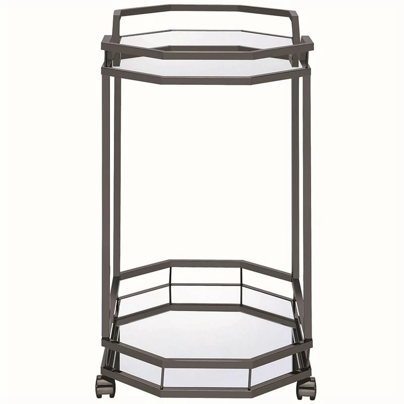 Gorgeous black nickel offers a tasteful finish to this retro-influenced bar cart. A compact unit that fits in snug spaces, it provides ample room for entertaining a small group. Dual surfaces feature a clear glass top shelf and mirrored lower shelf. Embrace a fun mid-century design that adds personality to a transitional space. Caster wheels allow full portability to work around any room.