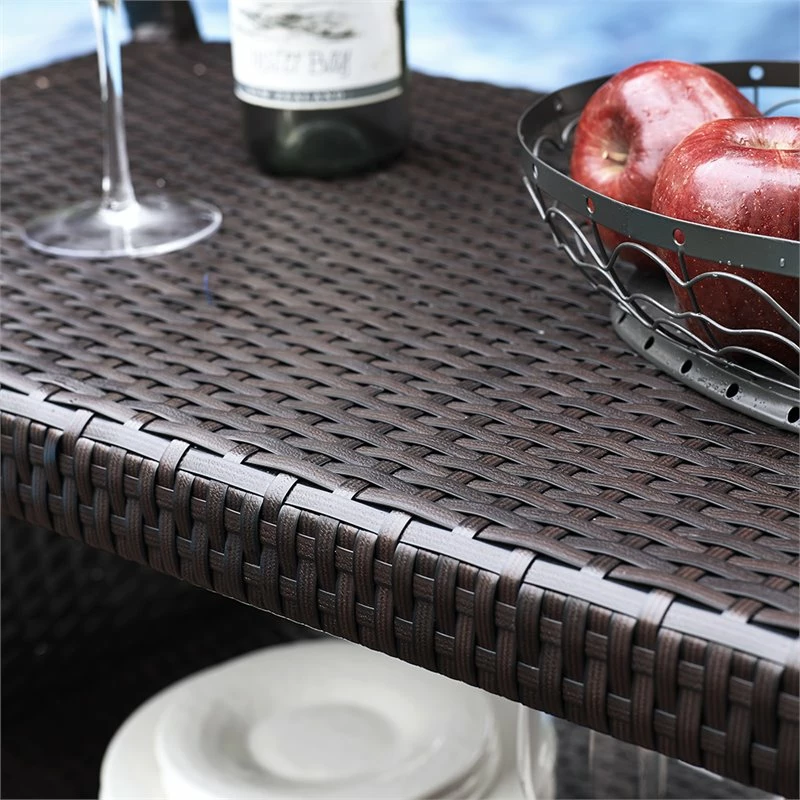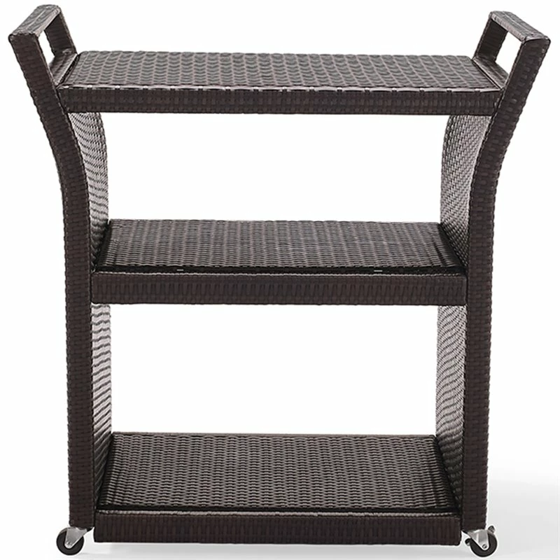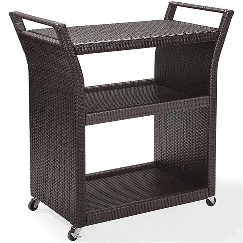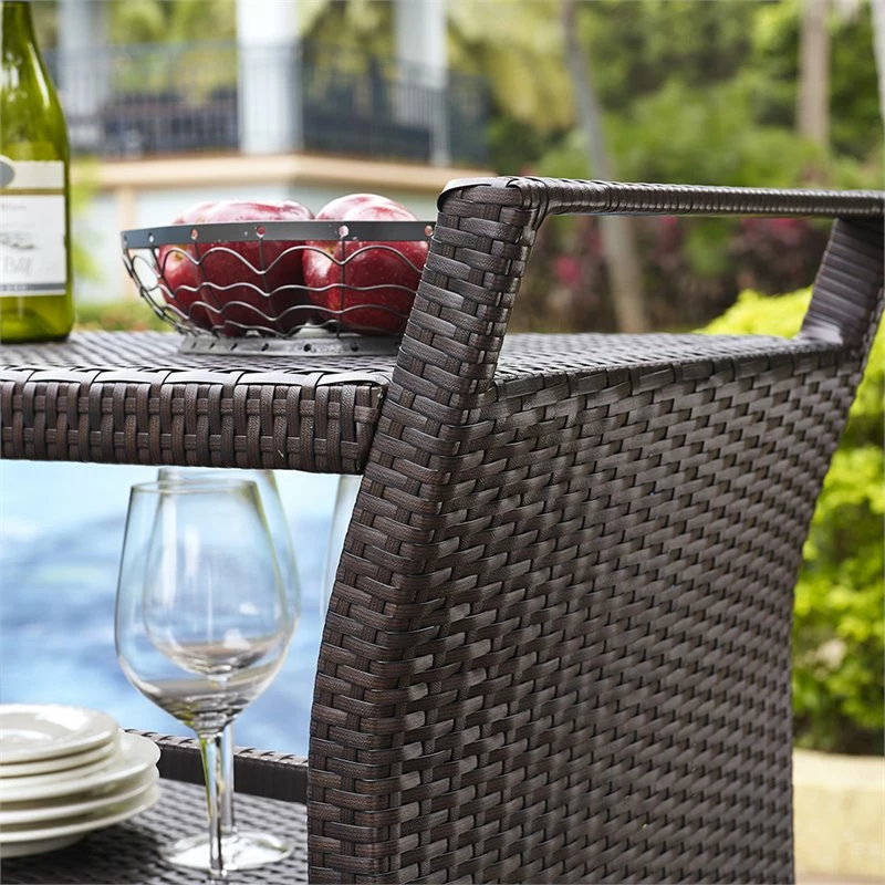 Bring bar entertaining outside with the Palm Harbor outdoor bar cart from Crosley. This wheeled cart offers rolling convenience at the poolside or patio with a wide serving surface and open storage below for ice buckets and liquor. Steer with the side handles, or use them for a handy towel bar. Constructed with woven weather-resistant wicker over powder-coated steel, nothing can get between this sturdy bar cart and the next outdoor happy hour.