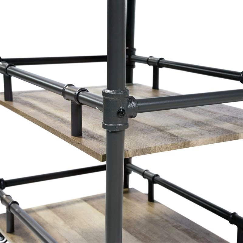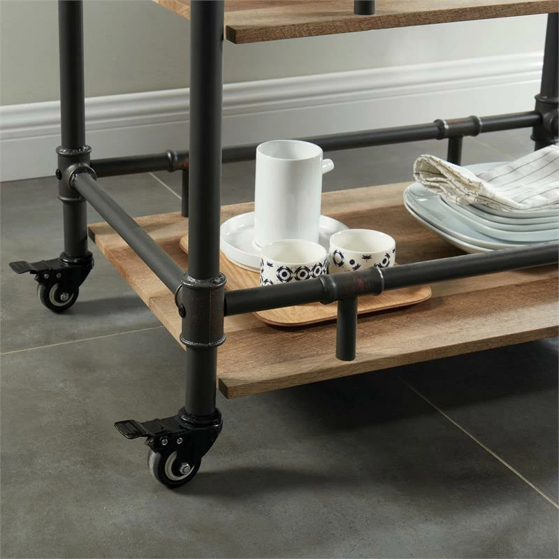 Transport your dining experience to your favorite restaurant with this uniquely designed metal Bar Cart. This cart features three spacious shelves that are guarded by sleek sand black metal rails for an industrial touch. The pipe-inspired frame, gliding caster wheels, and cart handle make this piece a convenient addition to any meal.