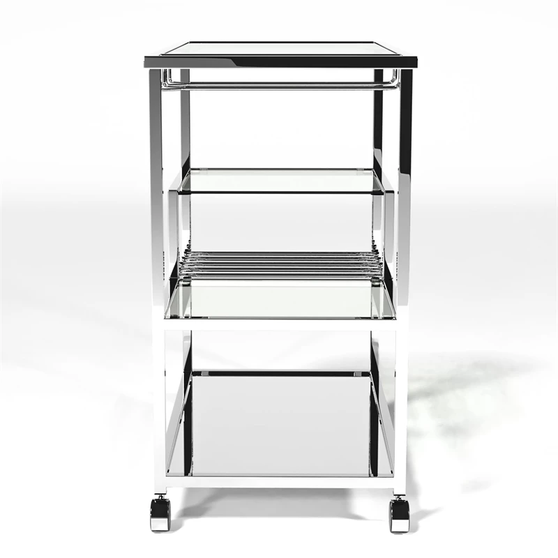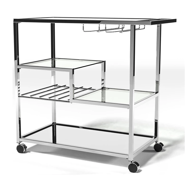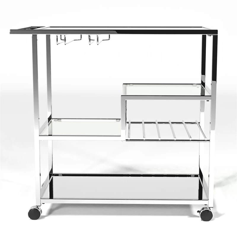 This shiny Bar Cart is constructed from metal and glass to create a glamorous appearance that is highlighted by the bottom reflective mirror shelf. Four gliding wheels are attached for your convenience when pushing the cart from room to room. Hanging stemware and wine racks are also included in this chic design with a gleaming chrome finish.