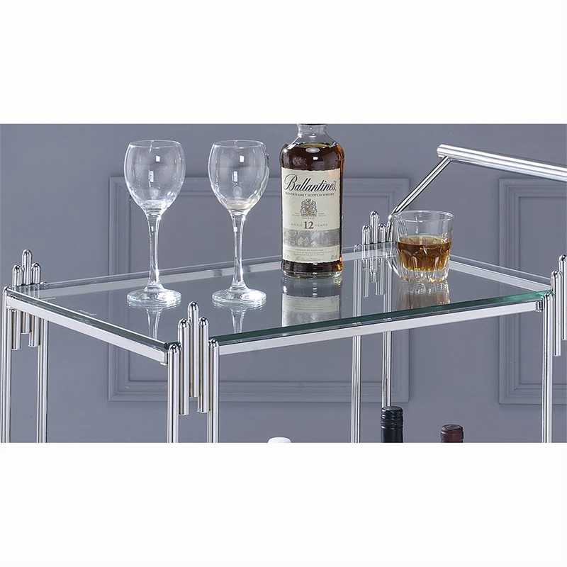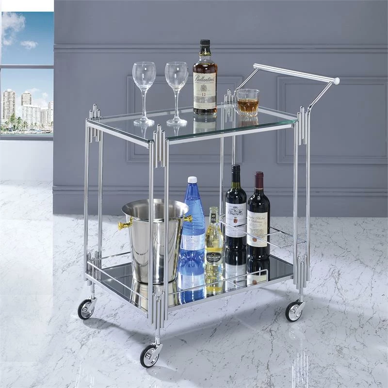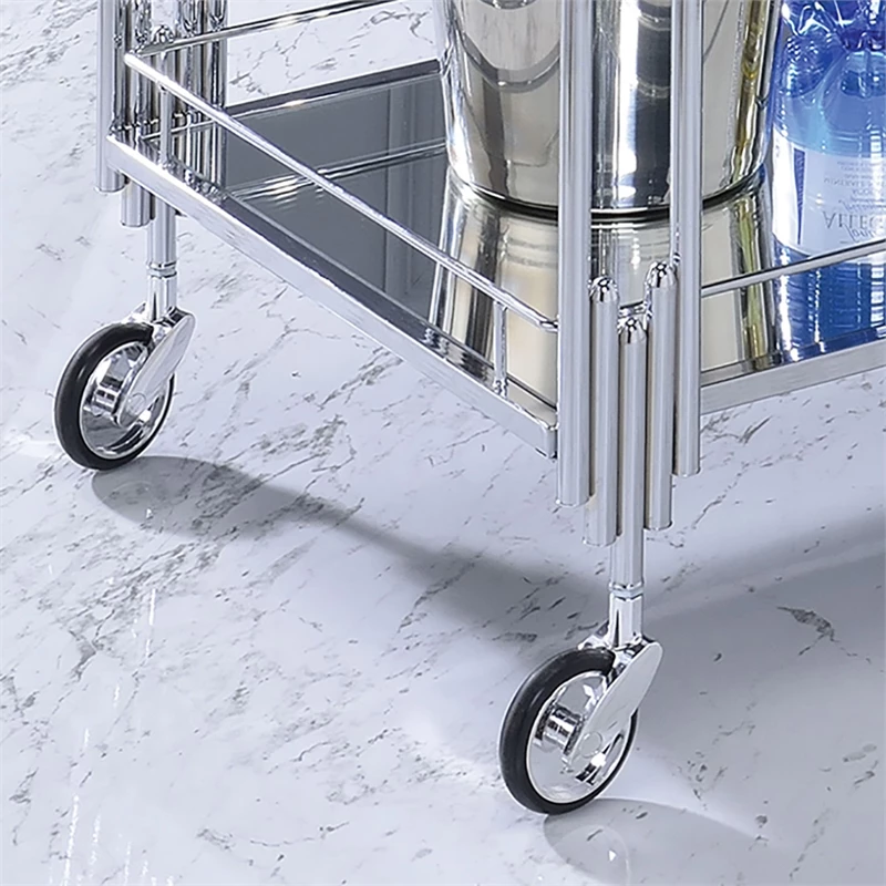 You and your fellow partygoers can take your drinks and snacks on the move with flair and glam on this metal and glass two-tier Bar Cart. It features a lustrous chrome frame and a built-in wine rack and is crafted with a towel rack and caster wheels as well as a top glass shelf and mirror bottom shelf for plenty of room for your signature drinks.