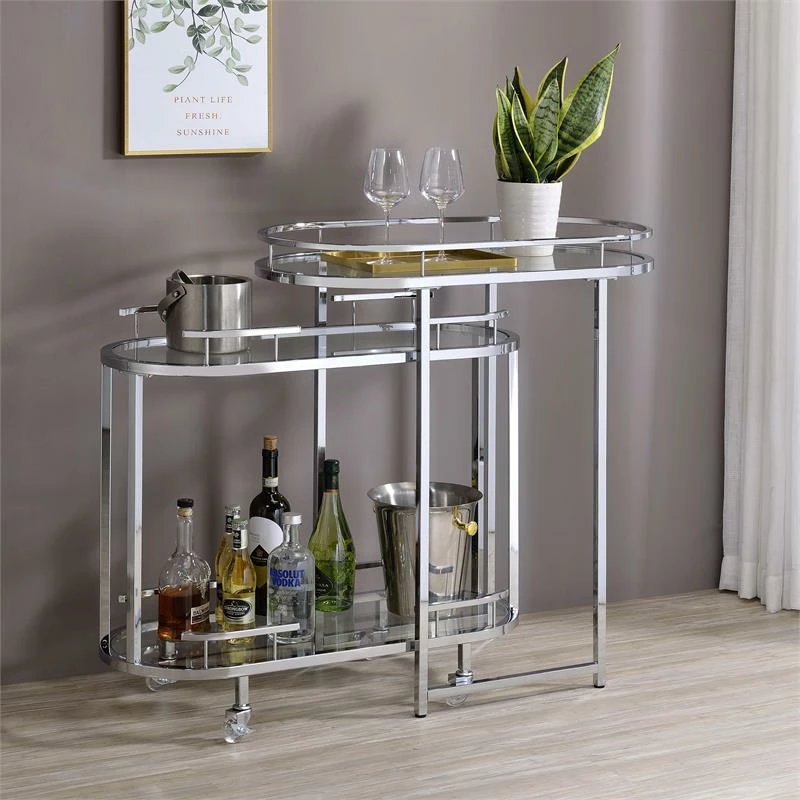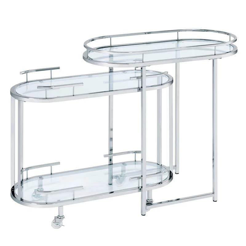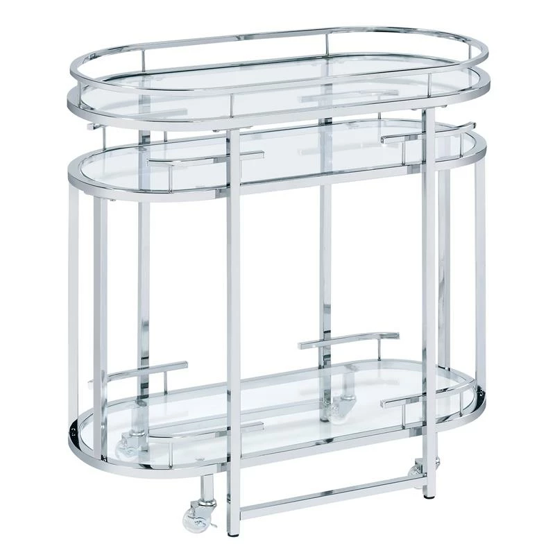 Live in luxury with this ultra-chic mobile serving cart, featuring a refined Art Deco-inspired flair. The oval shape metal frame wears a glossy chrome finish and holds three tempered glass shelves where you can keep stemware, drinks and other essentials for serving up cocktails and favorite wines. Transparent wheels of the nesting cart are equipped with brakes so you can park the minibar by your lounge seat.