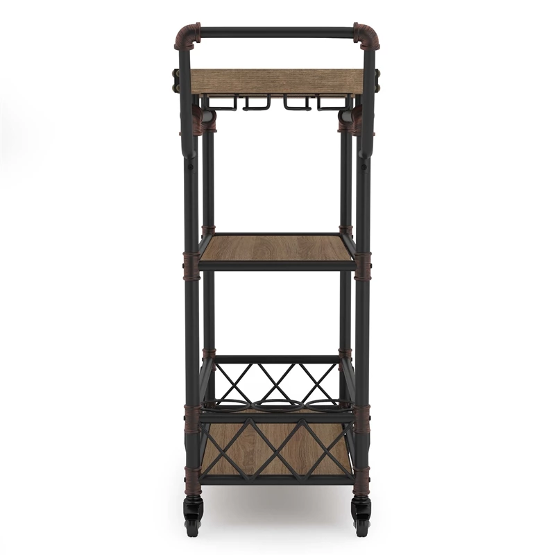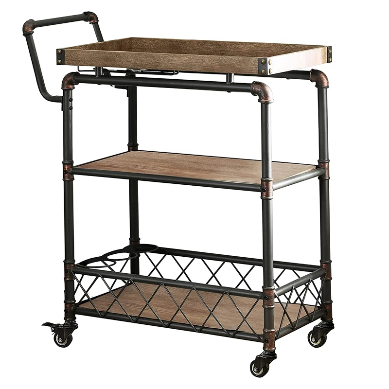 With a cool, vintage-inspired design, this industrial bar cart will have you serving drinks and snacks in style. From its sand black finish to its hand-brushed copper details to its natural wood shelves, this metal cart is a perfect match for a rustic or shabby chic living space. Three tiers of shelves provide ample space for refreshments and serving essentials. A lower guardrail and built-in wine rack keep fragile items safe and secure.