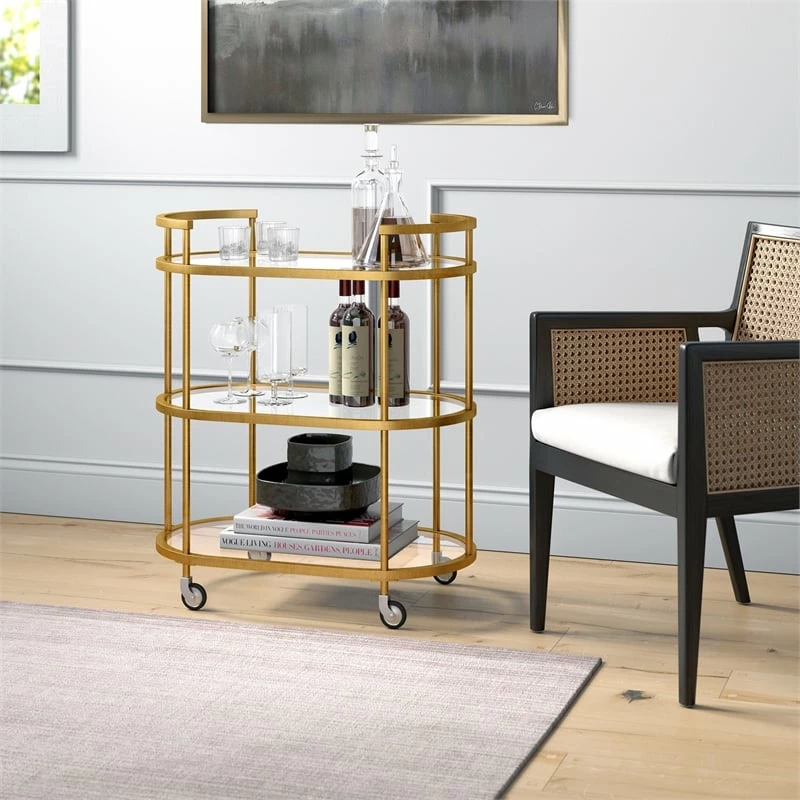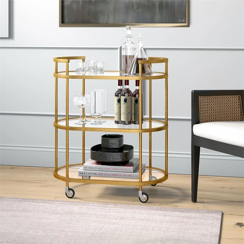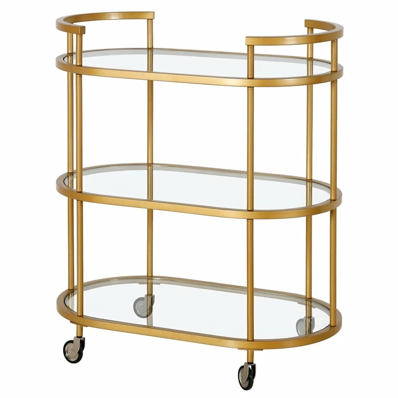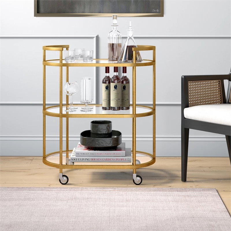 Combine functionality and on-trend design with this eye-catching modern bar cart. Its curved tempered glass shelves are offset by your choice of neutral metallic finishes. Handles and wheels provide easy mobility from room to room. Not a party animal? Re-purpose this piece as a coffee station, mobile vanity, or nightstand!