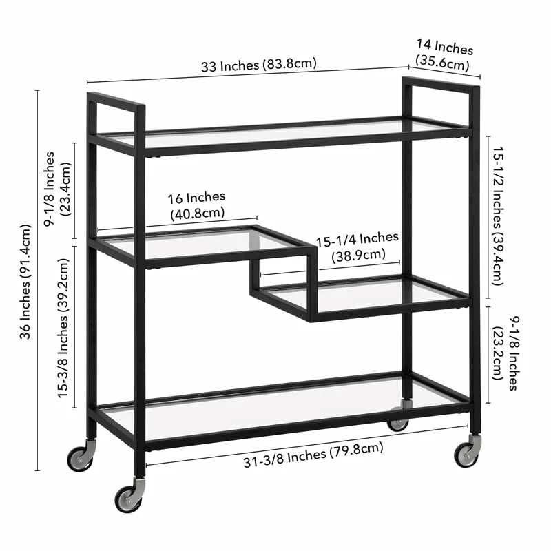 This modern contemporary bar cart is the perfect addition to your dining room or entertaining space. A sturdy metal frame borders the glass table top and two-tiered shelves. The raised frame provides security for your bottles and mixers while the four wheels provide easy mobility from room to room. Not a party animal? Re-purpose this piece as a coffee station, mobile vanity, or nightstand!
