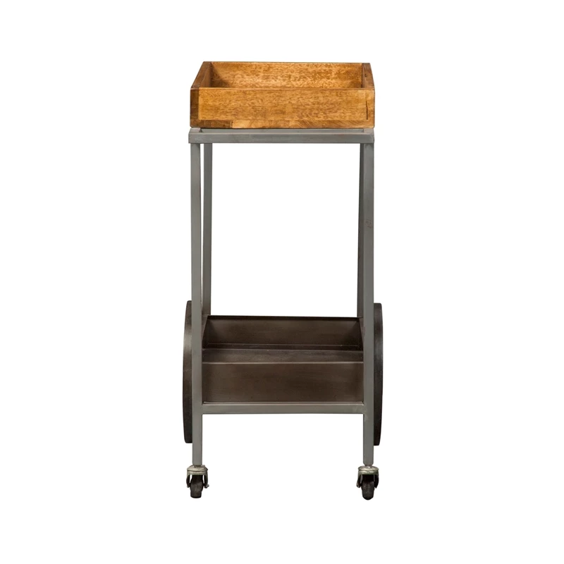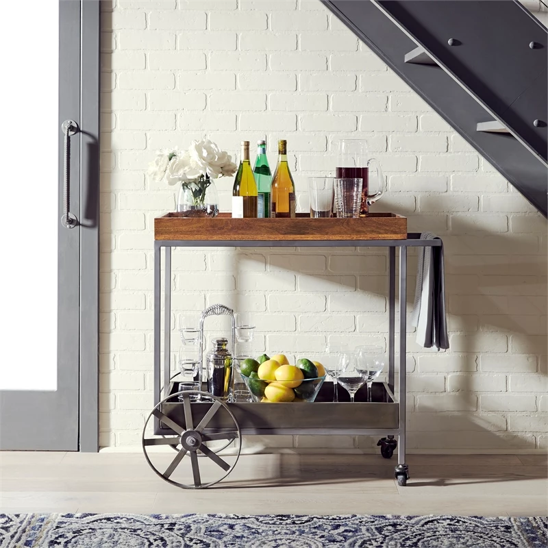 Raven bar trolley is perfect size for small spaces. Crafted of solid mango in a nutmeg finish with a hand painted metal shelf and frame. Great to use as a serving cart with its tray top and large metal wheels.