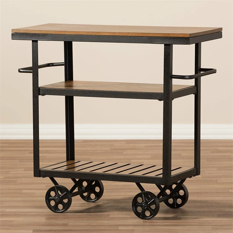 Roll this rustic kitchen island cart anywhere you need storage, counter space or a work area. Constructed of tubular metal in antique black textured finishing frame and distressed oak wood frame, this cart offers a solid structure for years to come. Slatted shelf at the bottom offers the storage of highball glasses and full-bodied blends while the middle shelf fit for plates and utensils. The upper top provides a large surface while you are serving your guests while four antique reproduction wheels offer mobility to place this bar cart anywhere it is needed. Two towel bars offer added function to this well-crafted cart. This cart requires assembly.