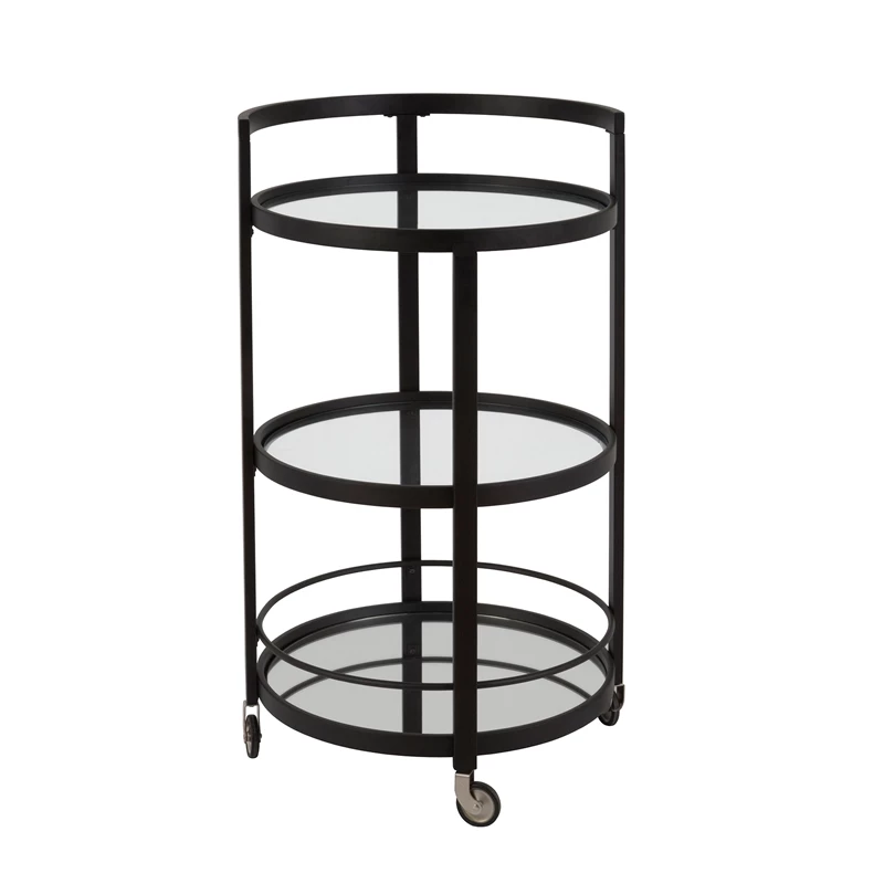 Savor the party with this contemporary bar cart. Railings keep your drinks in place, shelves handle mixers and assorted accouterments. Casters keep you on the move or locked in position. Roll with the flow with this serving cart, or mix things up; re-purpose this as a coffee and kitchen accessory center, grab-and-go walk-by closet, or nightstand!