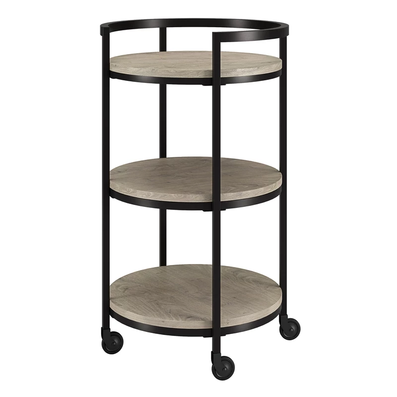 Combine functionality and on-trend design with this eye-catching modern bar cart. Its round wood-finish MDF shelves are offset by the clean lines of the steel blackened bronze frame. The raised frame provides security for your bottles and mixers while the four wheels provide easy mobility from room to room. Not a party animal? Re-purpose this piece as a coffee station, mobile vanity, or nightstand!