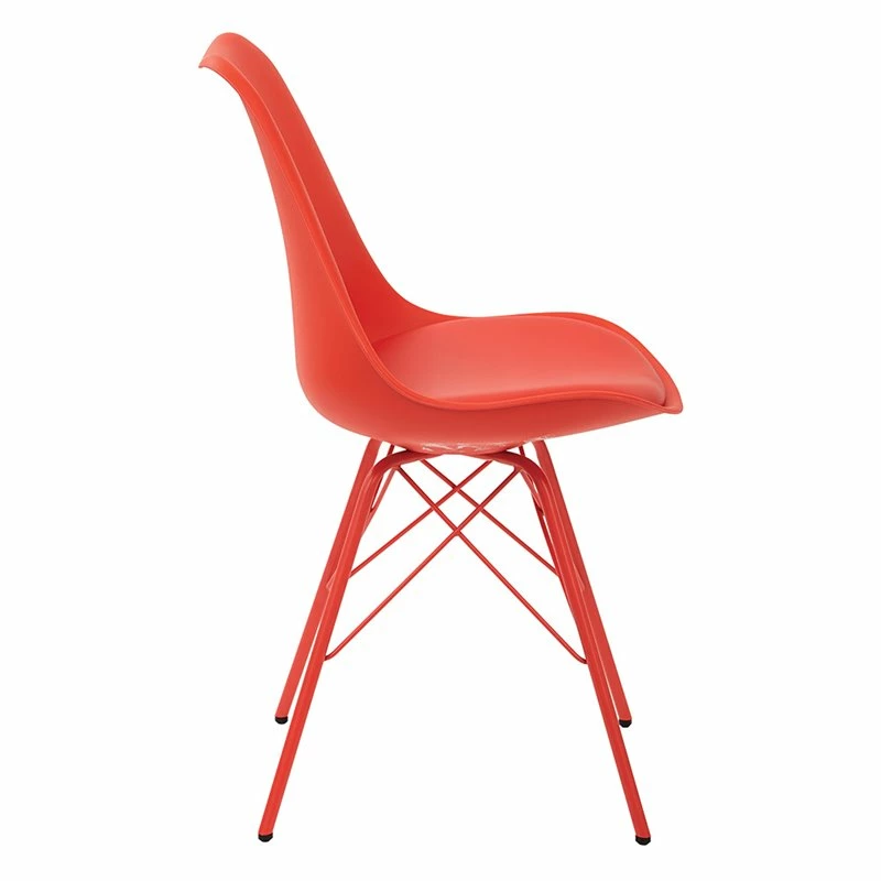 Emerson Red Side Chair with 4 Leg Base A mod-inspired chair brightens any space with energetic, funky colors. As boldly aesthetic as it is functional, you’ll sit contently against a molded PP shell contoured to the S-curve of your spine. Work comfortably atop a padded faux leather cushion fixed to sturdy powder-coated legs with an attractive crisscrossing metal design. With a modern throwback to times of Motown and mood rings, this task chair becomes more than a place to sit; it’s a super groovy home statement.