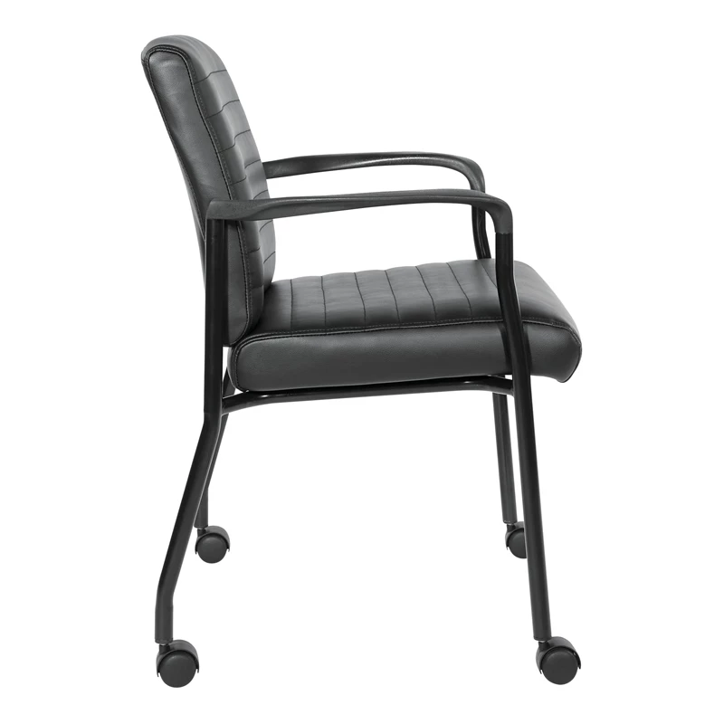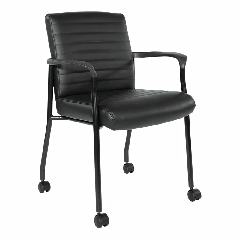 Guest Chair with Black Faux Leather and Black Frame This Guest Chair in Faux Leather with a Black Frame by Work Smart™ is subtly contoured for true comfort. Its thick, padded seat and back are designed with built-in lumbar support and upholstered in crisp, faux leather. A radial-style black frame adds style and stability to this versatile guest chair while dual-wheel locking casters make it easy to move.