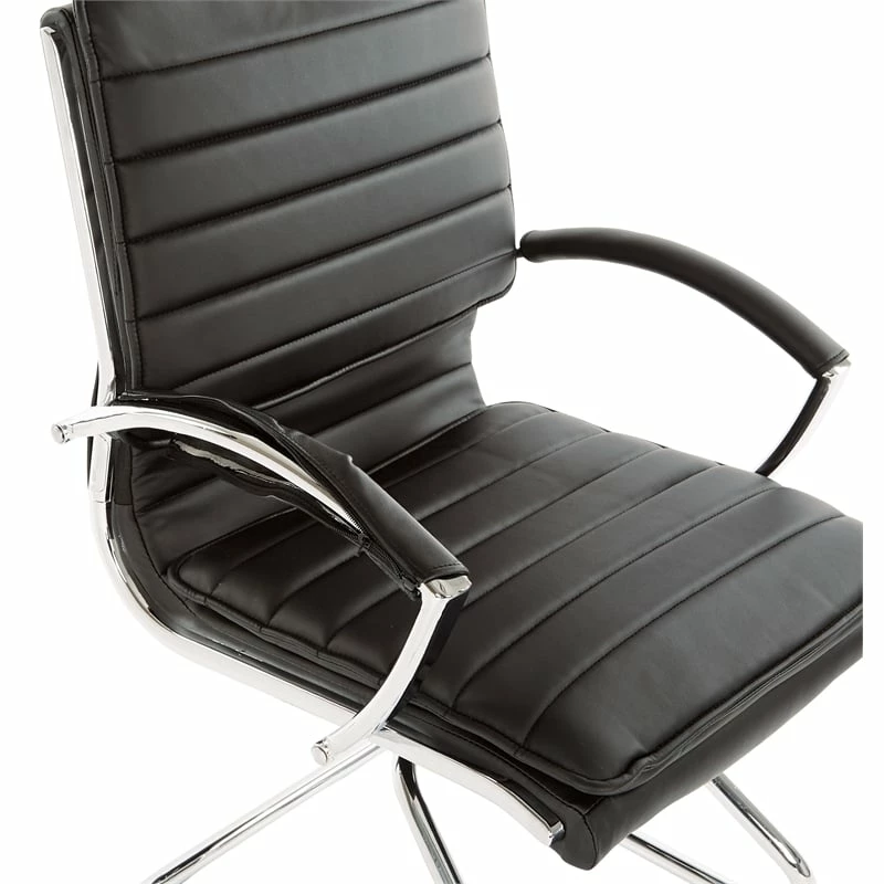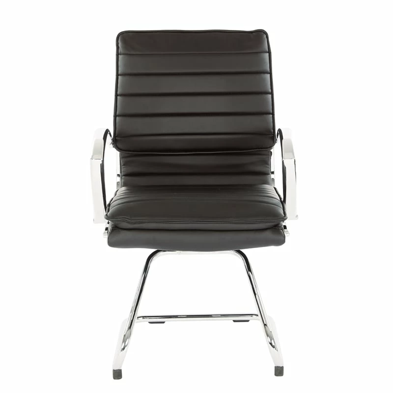 Guest Faux Leather Chair in Black with Chrome Base Strap in for a comfortable chair constructed in thick contoured faux leather. Adjustable tilt tension and locking tilt control put you in charge of this chair’s functionalities. Built-in lumbar support assures relaxing support during heavy work sessions. Beautiful chrome finishes and loop arms set the presentation for the Guest Faux Leather Chair from Proline II.