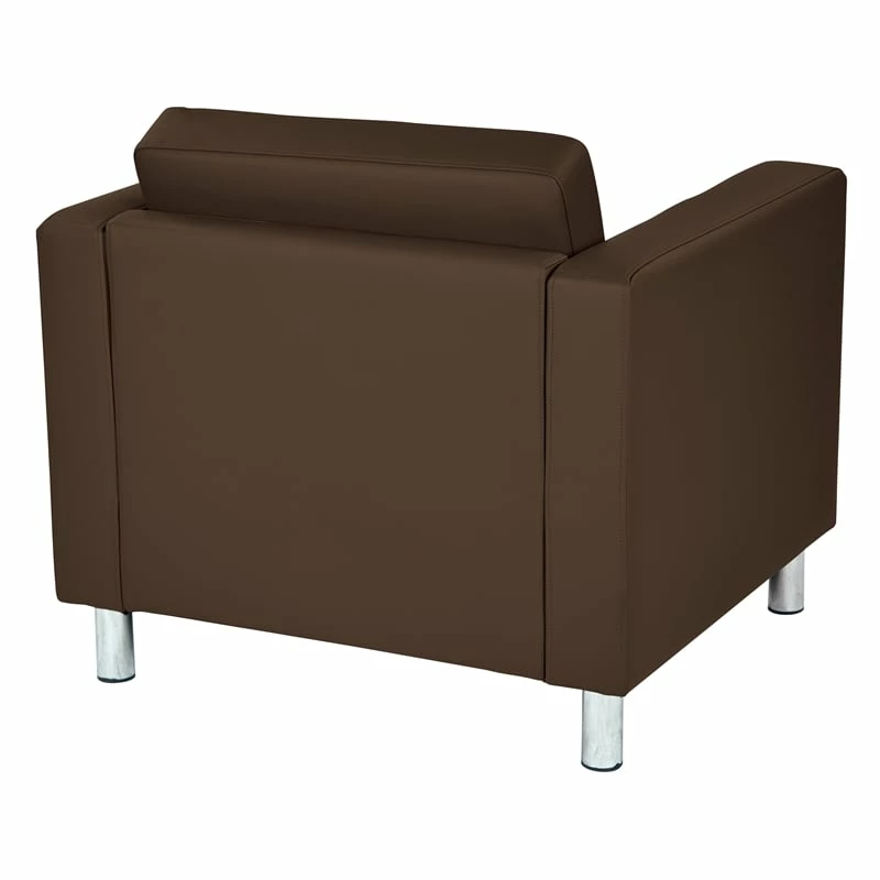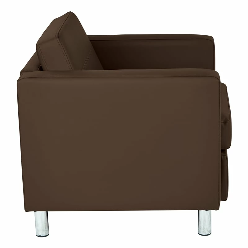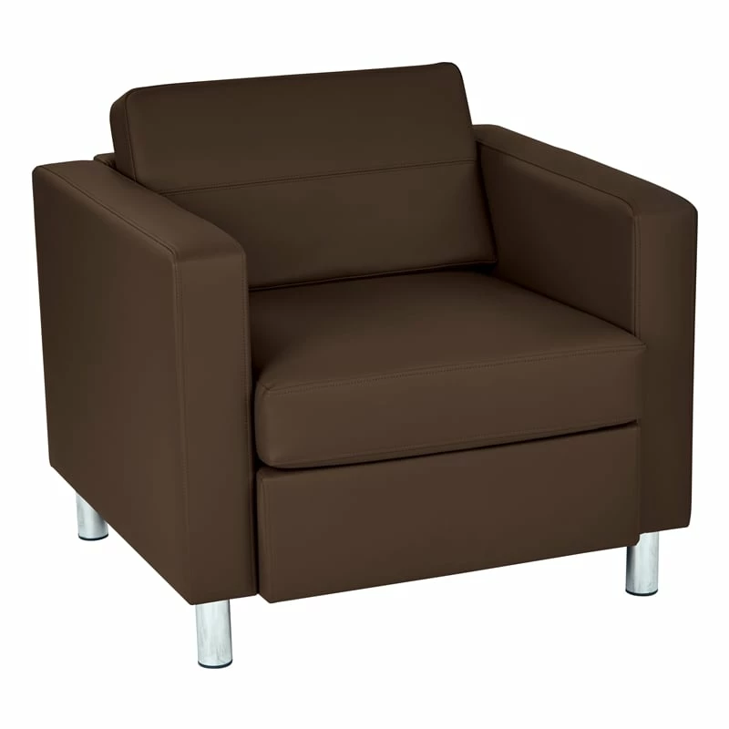 Pacific Armchair In Dillon Java Brown Vinyl Fabric Subtle grace and affordable comforts are guaranteed with the Pacific Armchair from Avenue Six. This club-style chair is designed with a contemporary edge in high-performance, easy-care vinyl. Equipped with a durable box spring seat that ensures your relaxation is well protected. All outfitted with silver leg finishes that prop this chair up and give it a chic display. The crisp, modern architecture of this club chair will certainly impress guests and decorate your home with refined taste.