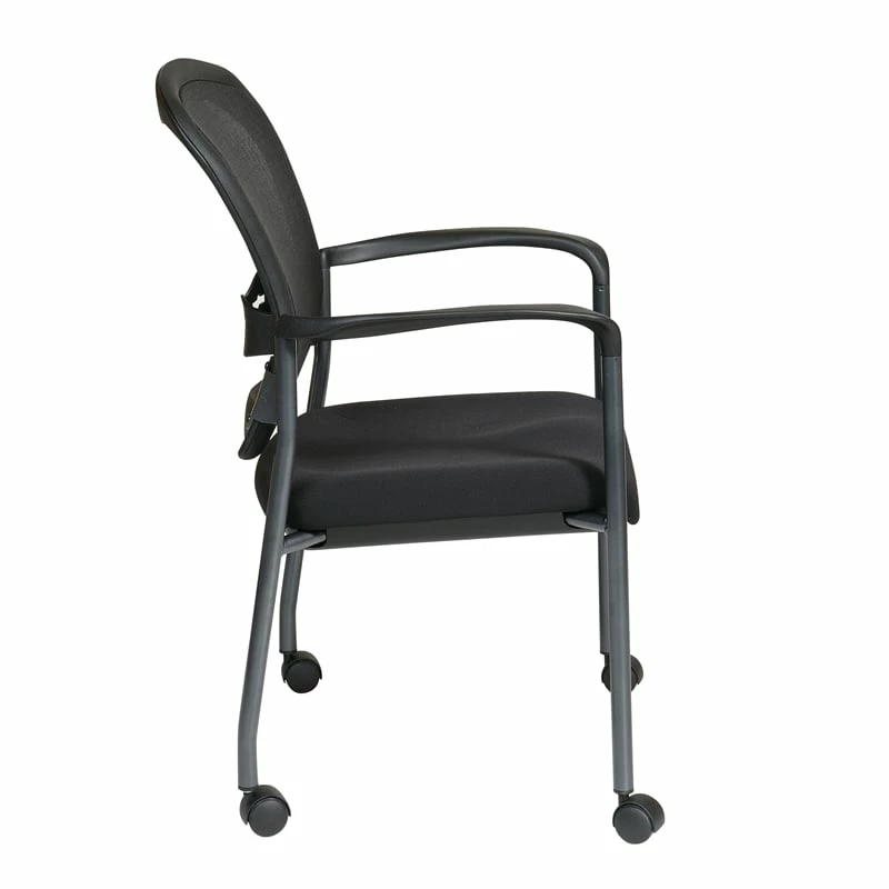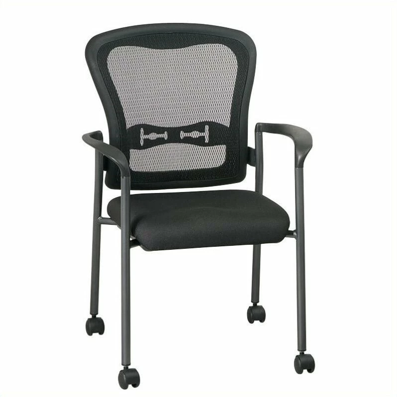Pro-Line II Titanium Black Visitors Guest Chair Welcome someone into your business and offer them a seat on one of our comfortable Pro-Line II® Deluxe Stacking chairs. This sturdy Titanium finish chair features a breathable ProGrid® Back with built-in lumbar support and Coal FreeFlex® padded fabric seat and come complete with Nylon armrests and dual wheel carpet casters. Designed to be stackable to save precious office space when not in use, our GreenGuard indoor air quality certified chairs are backed by a limited lifetime warranty, so customers & employees alike will enjoy using your chairs for years to come.
