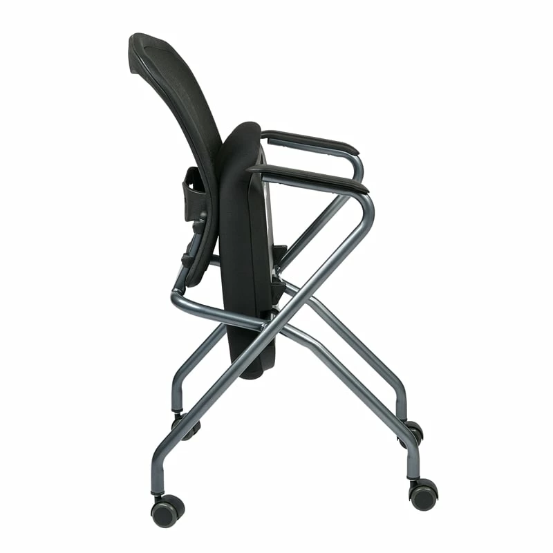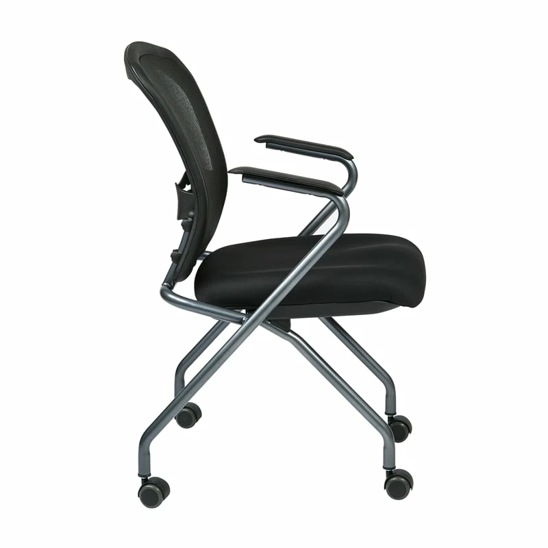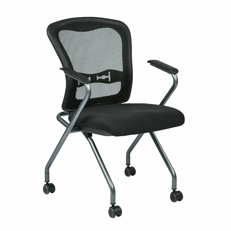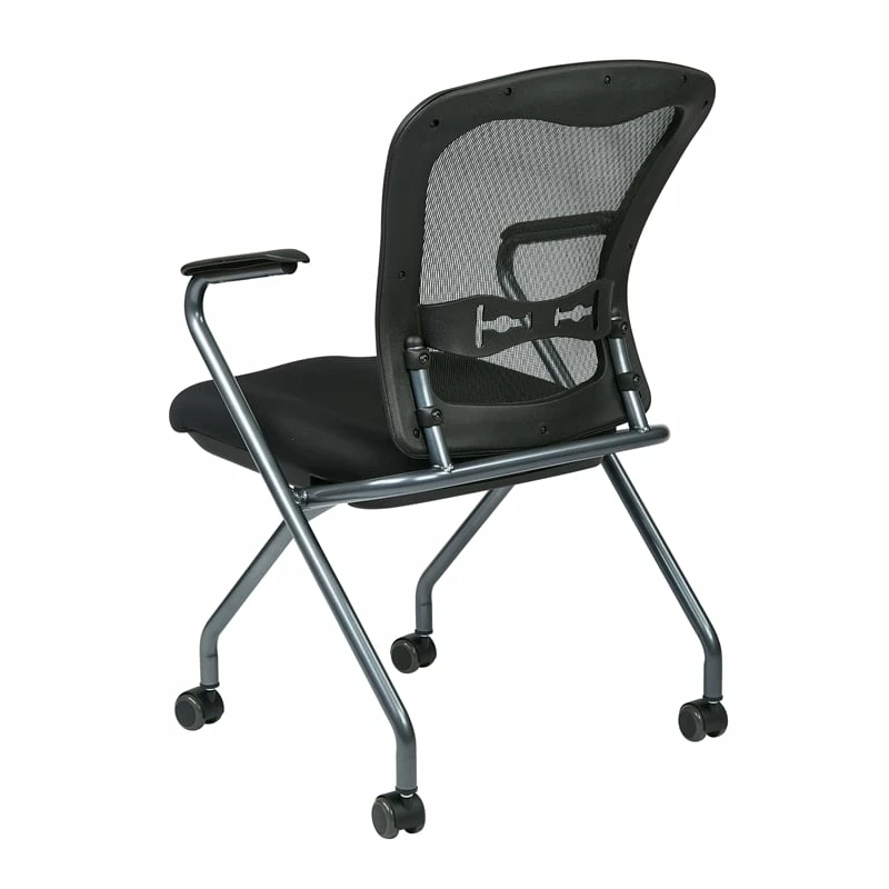 Set of 2 Deluxe Folding Chair with Arms in Coal Black Fabric Welcome someone into your business and offer them a seat on one of our comfortable Pro-Line II® deluxe folding chairs. This sturdy Titanium finish chair features a breathable back with build in lumbar support and Coal FreeFlex® padded fabric seats and comes complete with Nylon armrests and dual wheel carpet casters. Sold in 2-Packs and designed to fold up horizontal for nesting to save precious office space when not in use, our GreenGuard indoor air quality certified chairs are backed by a limited lifetime warranty, so customers and employees alike will enjoy using your folding chairs for years to come.