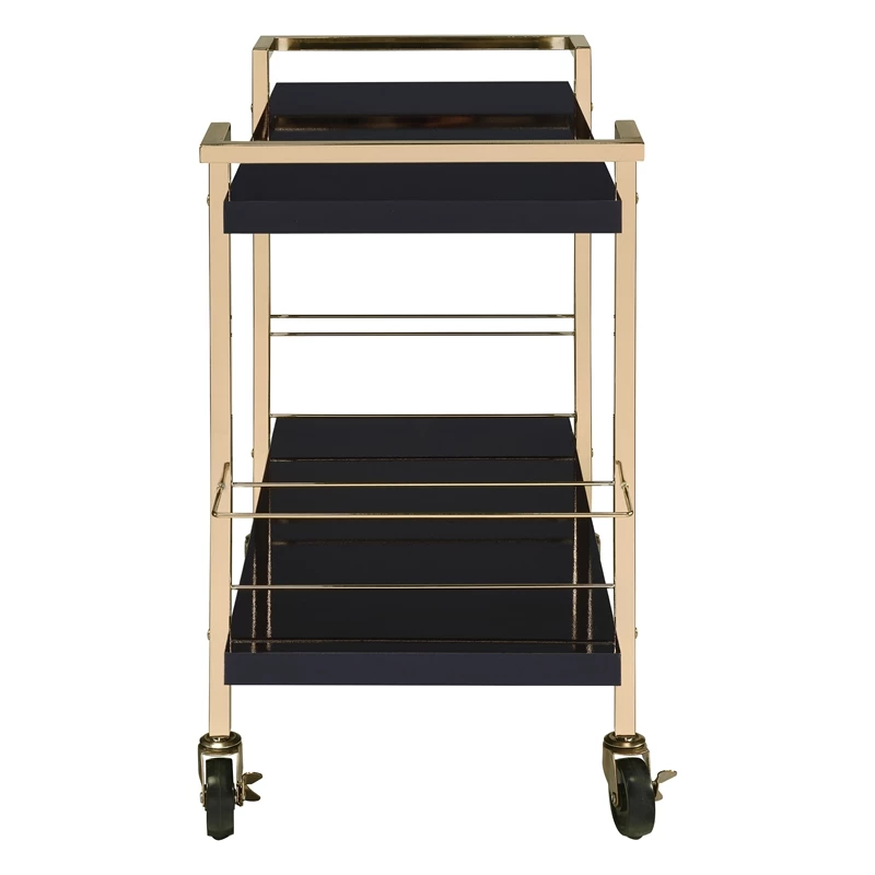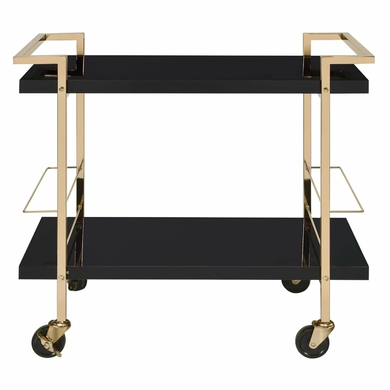 Alios Serving Cart in Black Metal and Gold Frame Host guests with panaches and style with the Alis 2-tier serving cart. Our bar cart is perfect for serving guests, hosting parties, or just having a place to store an attractive cocktail setup. 2-Tiers provide plenty of room for beverage prep and glassware storage. Dual bottle caddies keep wine bottles safe from tipping while rolling smoothly to where the action is. The ultra-luxe and modern gold-plate frame adds a sophisticated design element, and the high-gloss white laminate cleans up with just a wipe. Locking casters make sure the cart stays put while you enjoy serving guests your finest doxology.