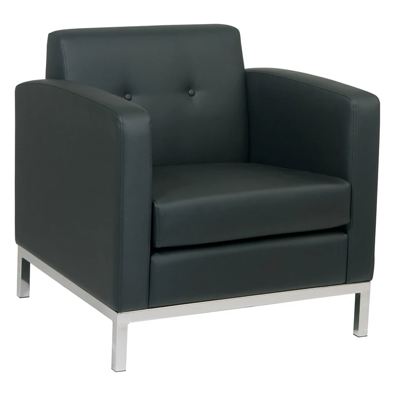 Wall Street Armchair Black Faux Leather Amazing & affordable style arrive in the form of this New Addition to the Wall St. Collection. Constructed of High-Performance Easy-Care upholstery, this faux Leather Club Chair is alluringly designed with a contemporary edge. This design-savvy furnishing features a box spring that provides for solid structural support and comfort, overlay button details for added interest, and a sleek chrome-finished square edged metal base for a modern aesthetic and additional durability. Masterfully constructed of high-quality upholstery, this chair is the perfect addition to any home or office that begs for a fresh and updated look. The linear profile of this piece gleams with a geometric style which provides for a clean and crisp feel that is sure to impress those of even the most refined taste. Conveniently available in classic brown, brilliant white, up-town black, and chic smoke, you will be able to easily match this fantastic right Armchair to your existing furnishings. Combine all this with the 15 Year Limited Warranty and GreenGuard Certification, you have peace of mind in knowing that this environmentally friendly club chair is built to last. Add to cart now and start enjoying this awesome piece for years to come.
