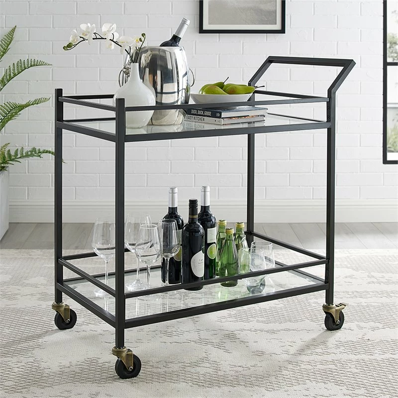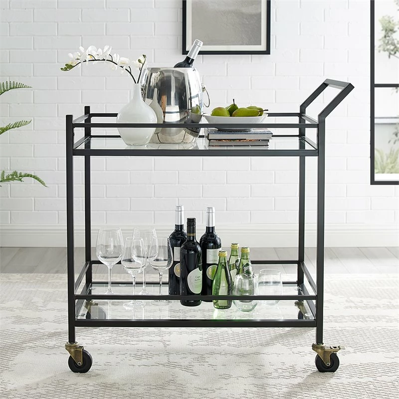 Stylish and modern, this bar cart is an eye-catching addition to any home. The sturdy steel frame and tempered glass shelves create a simple silhouette that works with a variety of décor aesthetics. Fitted with four casters, this bar cart is a flexible piece that brings “spirit” to any room in your home.