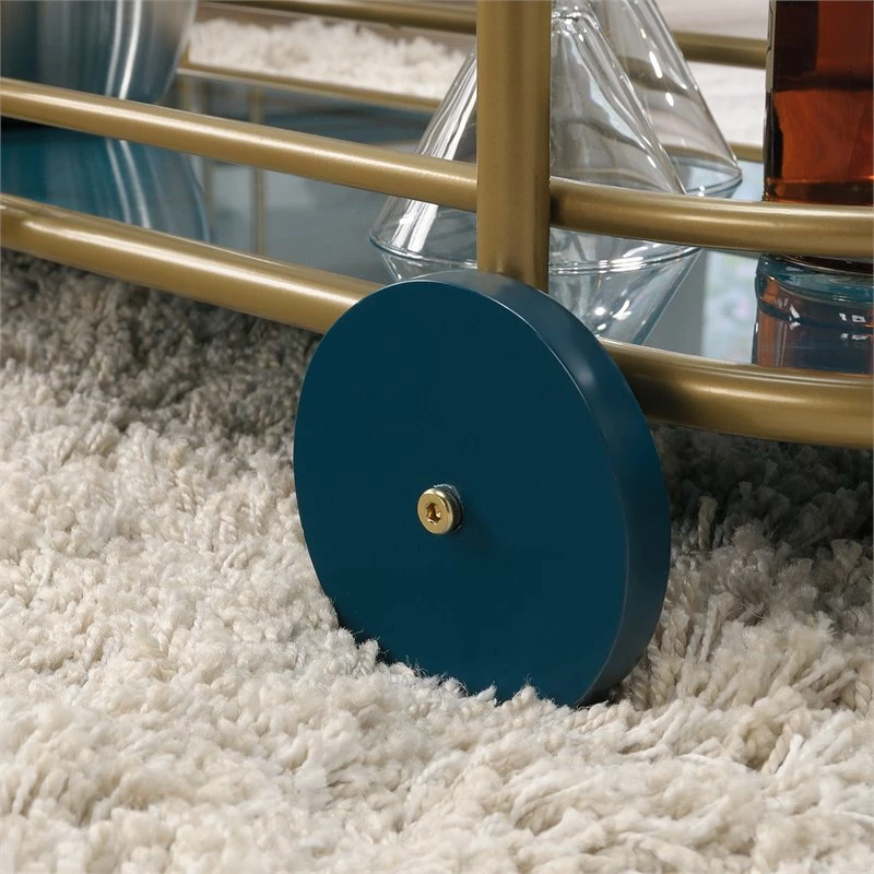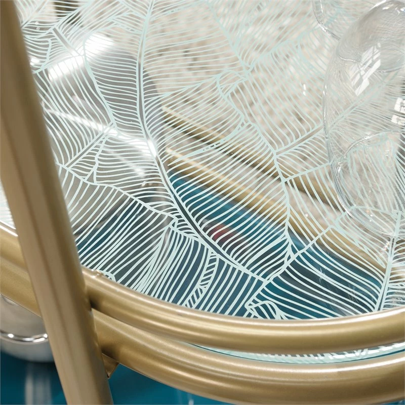 Who doesn’t love the perfect bar cart? We sure do! Create a one-of-a-kind aesthetic in your home with the unique design and charming good looks of this bar cart. This metal bar cart features three safety-tempered glass shelves. The spacious top shelf provides you with the room you need for various items like glass bottles, stacks of napkins, a bowl of limes, and a yummy cheese tray. The middle shelf provides you with the perfect amount of additional space for items like straws and glasses. Don’t worry, there’s still more storage. The large lower shelf provides you with even more space for other miscellaneous items. For an added touch of style, this gold bar cart features a banana leaf abstract pattern on the middle shelf and a teal tinted silk-screened glass on the lower shelf. This modern bar cart is constructed from a powder coated metal frame for added style and durability. Other features include front casters for easy mobility throughout your home. Finished on all sides in Satin Gold, this stunning bar cart is just what you’ve been missing for your next party.