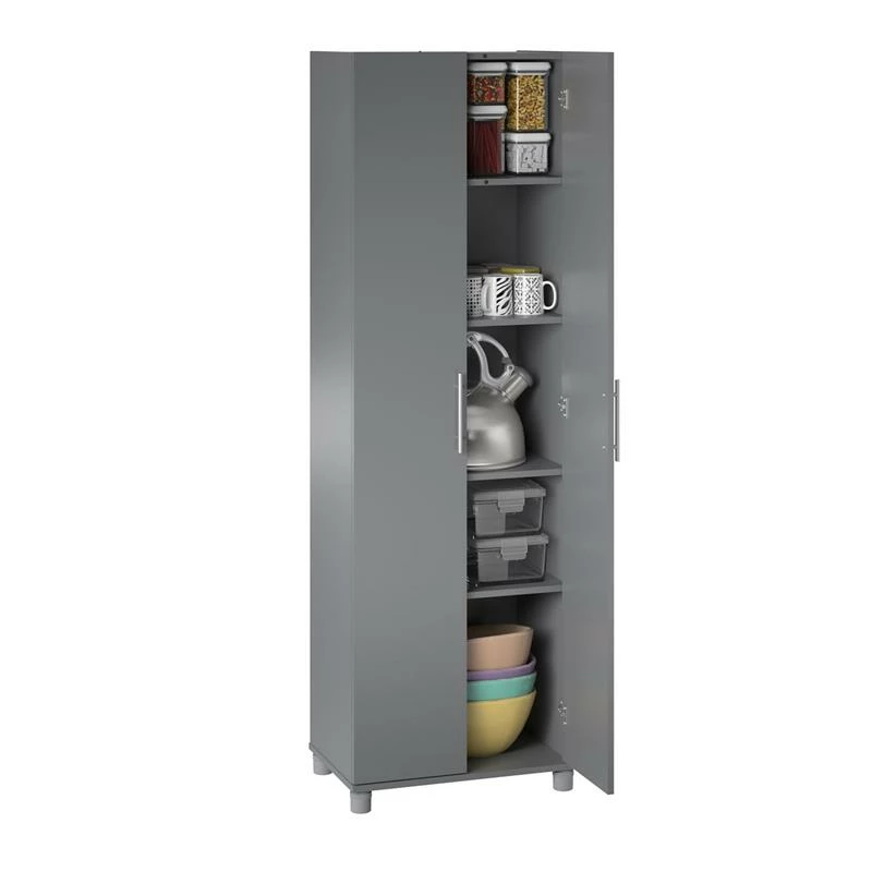 Add much needed storage space to any room in your home with the 24” Storage Cabinet. Made of laminated particleboard, the graphite gray finish and satin nickel hardware pair nicely with most any décor so the Cabinet can be used wherever extra storage is desired. The interior of this Cabinet features 5 shelves, 3 adjustable, allowing you to customize your storage for both small and large items. Store and organize anything from office supplies to cleaning supplies and even kitchen pantry items. The adjustable feet make keeping your Cabinet level on uneven floors simple, and also keeps the unit up off the floor protecting the bottom from spills or standing water. A wall anchor kit is included to secure the Cabinet to the wall and prevent tipping injuries. The Storage Cabinet ships flat to your door and 2 adults are recommended to assemble. Once assembled, the Cabinet measures 74.29”H x 23.7”W x 15.39”D.