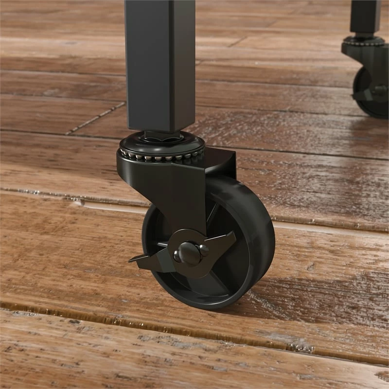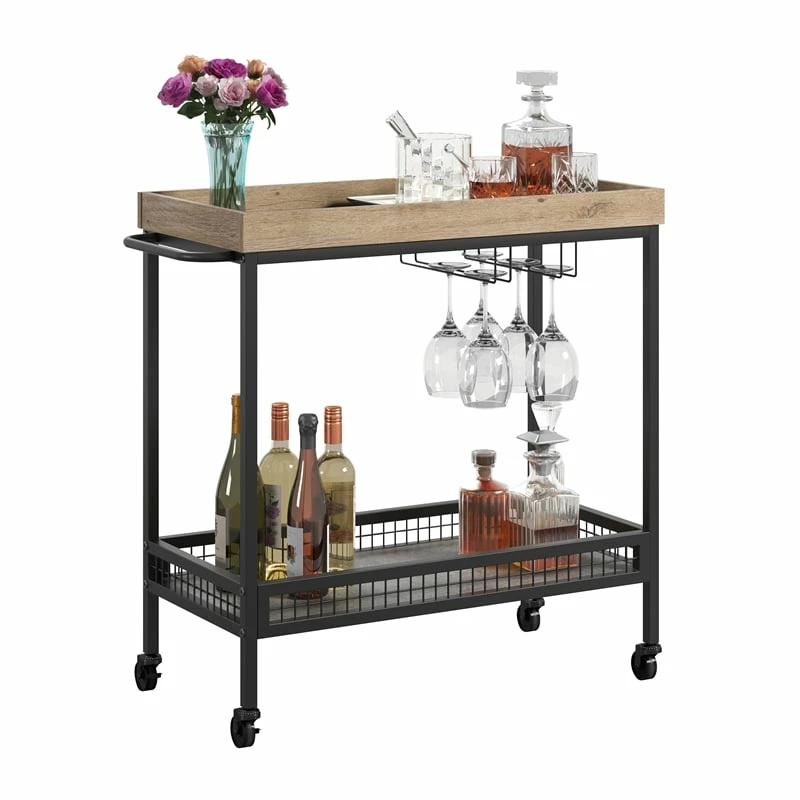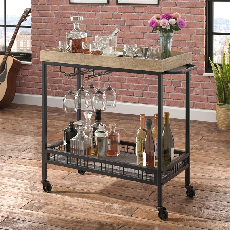 Your drink service will be the talk of your next get together with friends and family with this bar cart from the Market Commons® collection. This wood and metal bar cart features two shelves for storage and display of highball glasses, bottles of wine and spirits, orange peels and lemon wedges, and more. Under the top surface of this bar cart with wheels is hanging racks for stemware, offering a convenient place to store your wine or martini glasses. Refills are easy to reach with the four rolling casters (two locking) on this bar cart with storage. Finished on all sides for versatile placement, this modern bar cart will look polished from every angle. A Prime Oak® finish with Slate Gray™ accents and a durable, powder coated metal frame are the finishing touches that make this rolling bar cart a must-have for your next gathering.
