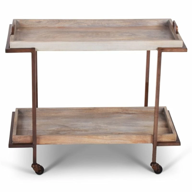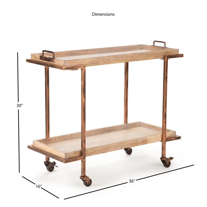 Serve your guests in style with the Conway Bar Cart featuring a light distressed finish on the trays with a copper plated iron frame. The top tray is removeable for easy serving and wheels allow you to take items to where the guests are.