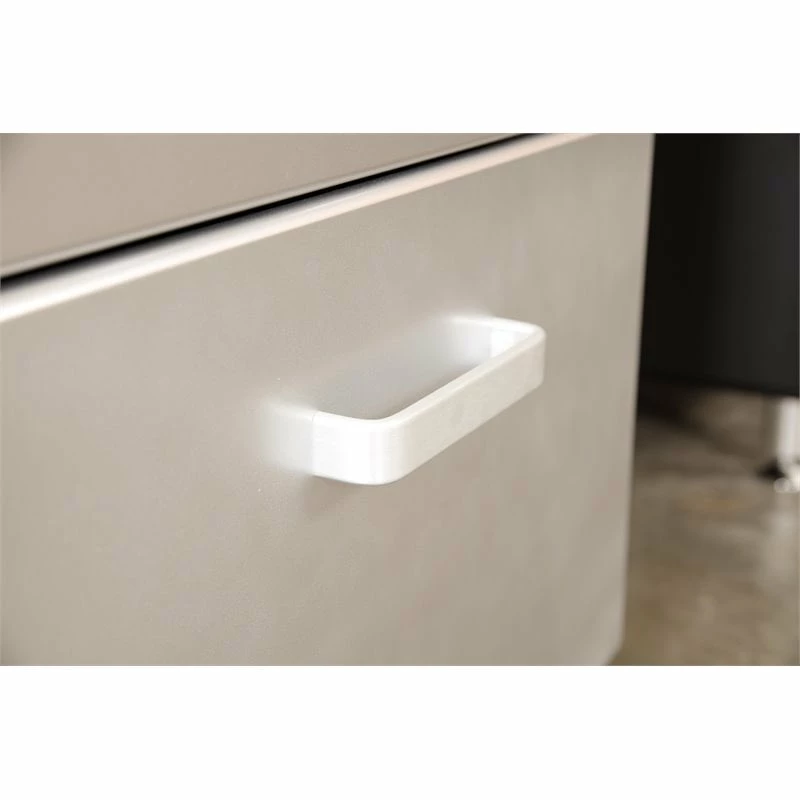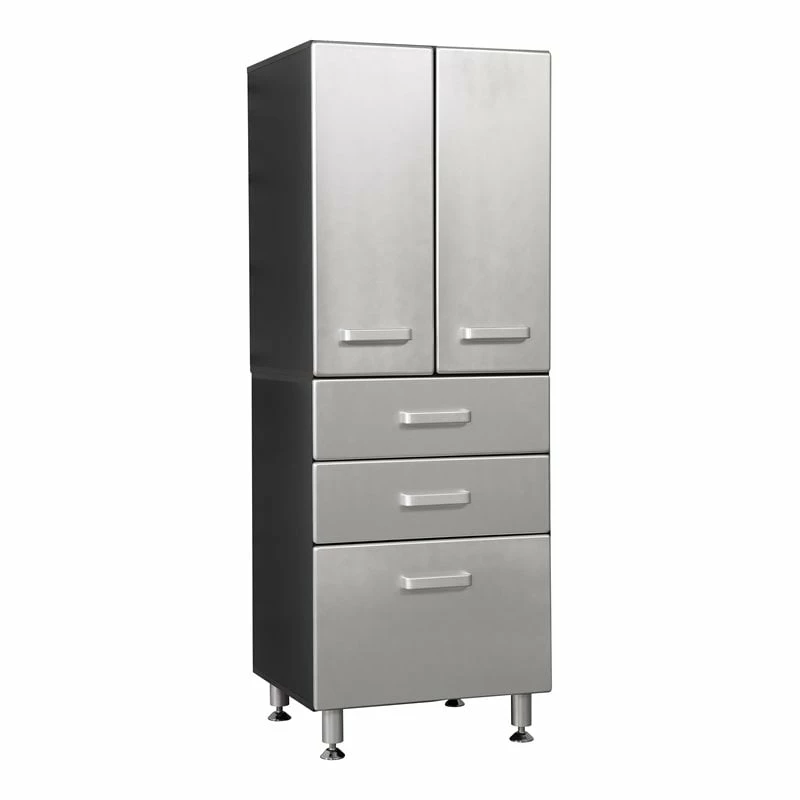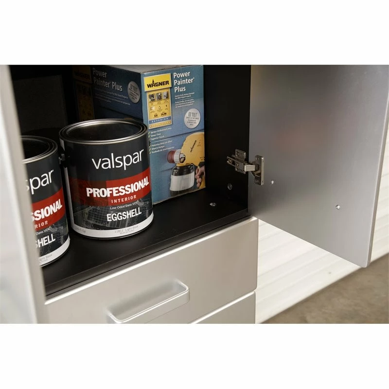 The Tuff-Stor Garage Storage Cabinet combines versatility, durability, and attractive design to create a clean and organized storage system. With two sturdy shelves measuring 22 inches wide by 19 inches deep you will be able to store almost everything, even larger items. One of the shelves is removable or adjustable. Since many garage floors are not totally level, each item comes with four attractive aluminum extruded and adjustable feet that elevate and allow you to level your system and keep it safe from water and road grime. The oversized, industrial aluminum door pulls are both sturdy and easily accessed. The doors are painted with an attractive silver, metallic finish. The three drawers feature metal ball bearing full extension slides and a solid medium density fiber board bottom.