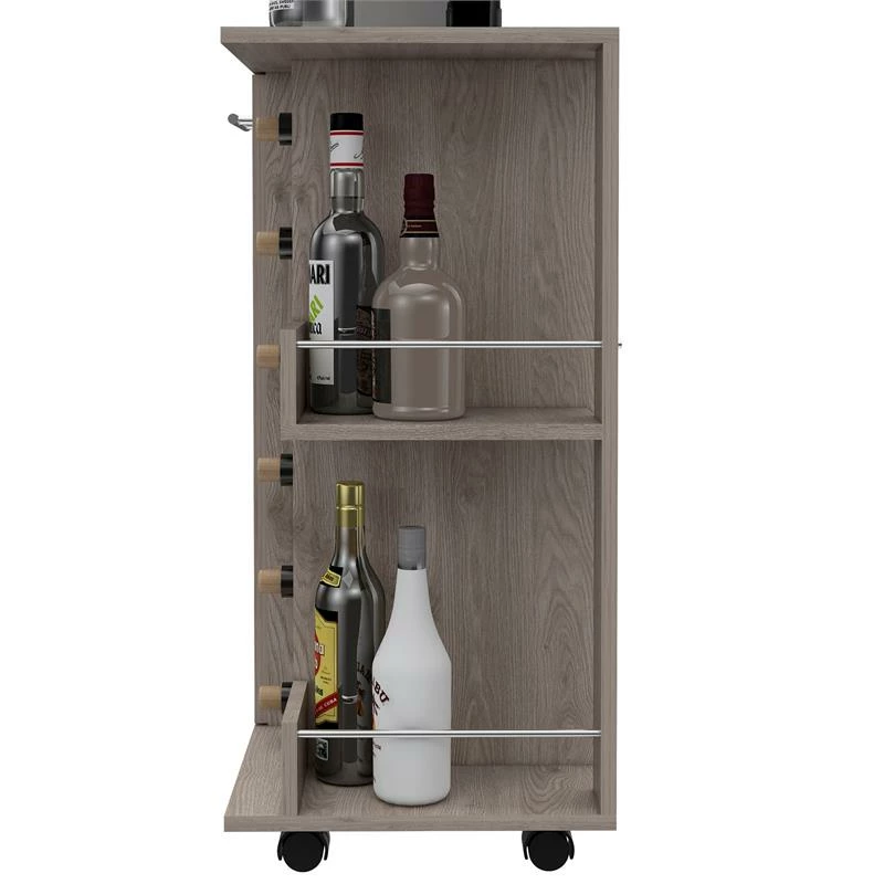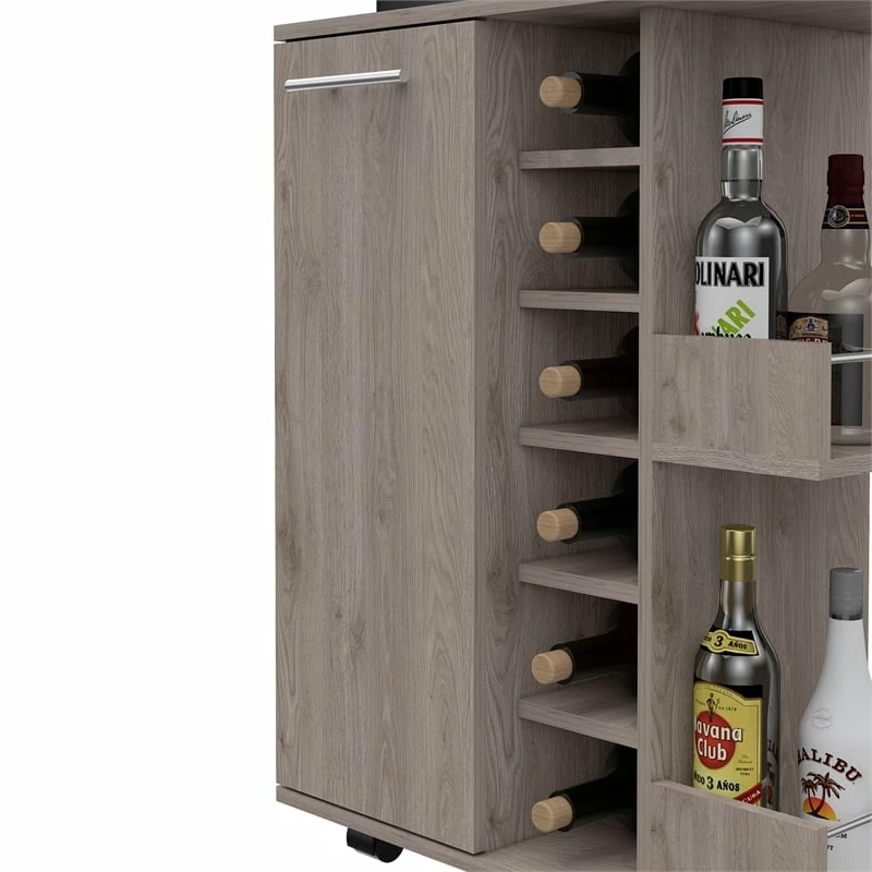 The Tuhome Bar Cart Cabinet brings mobility and functionality together. The smooth open top counter is perfect for placing cocktails during a function or showcasing decor any other day of the week. Six cubbies vertically line the middle of the unit while a large two-tiered shelf cabinet space on the left provides the perfect storage option for all your bottled needs. Two large side shelves for displaying your finest spirits complete this modern stylish piece. Made of engineered wood in a light gray finish