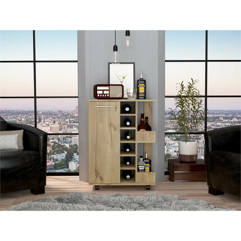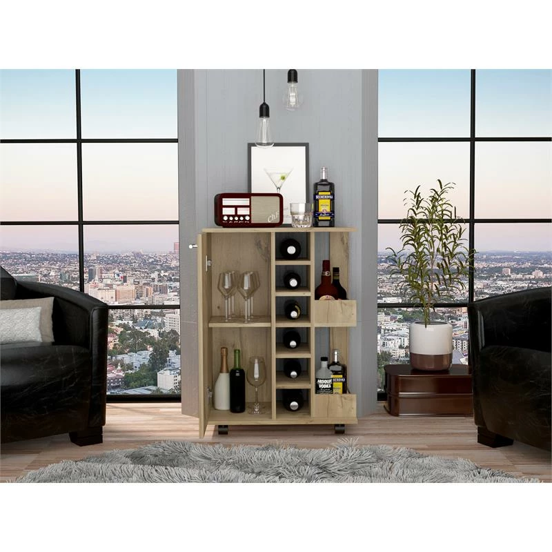 The Tuhome Bar Cart brings mobility and functionality together. The smooth open top counter(23,6”W X 14,7”D) is perfect for placing cocktails during a function or showcasing decor any other day of the week. Six cubbies vertically line (5,5” W X 4,5”H) the middle of the unit, while a sizeable two-tiered shelf cabinet space on the left provides the perfect storage option for all your bottled needs. Two large side shelves (6,4” W X 14,1”H) for displaying your finest spirits complete this modern, stylish piece, with the possibility to adapt in your favorite place thanks to its caster wheels. Product dimensions (23,6”W X 14,7”D X 32,3”H) Designed with elegant and resistant light oak particleboard finish.