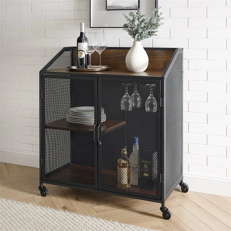 Budget β¨ Walker Edison 33″ Industrial Mesh Metal Doors Bar Cart With Locking Casters In Dark Walnut π₯°